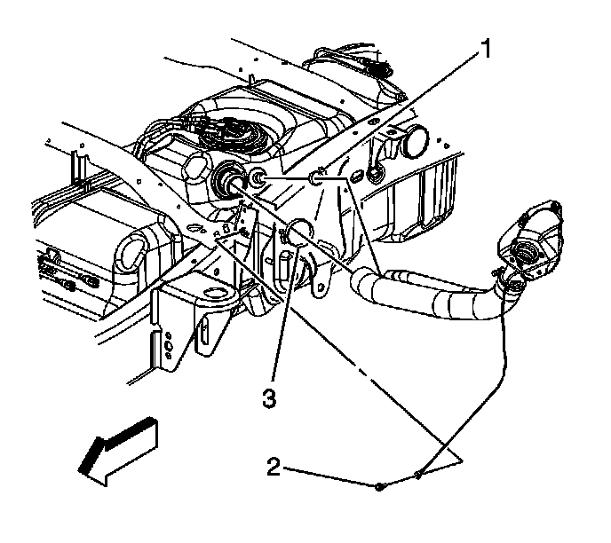 3. Loosen the fuel tank fill pipe clamp (3) at the fuel tank.