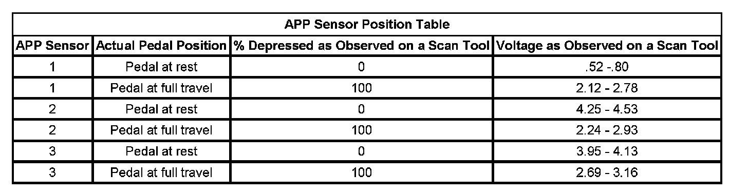 - The APP indicated angle is limited to 0 percent. The control module only allows the engine to idle.