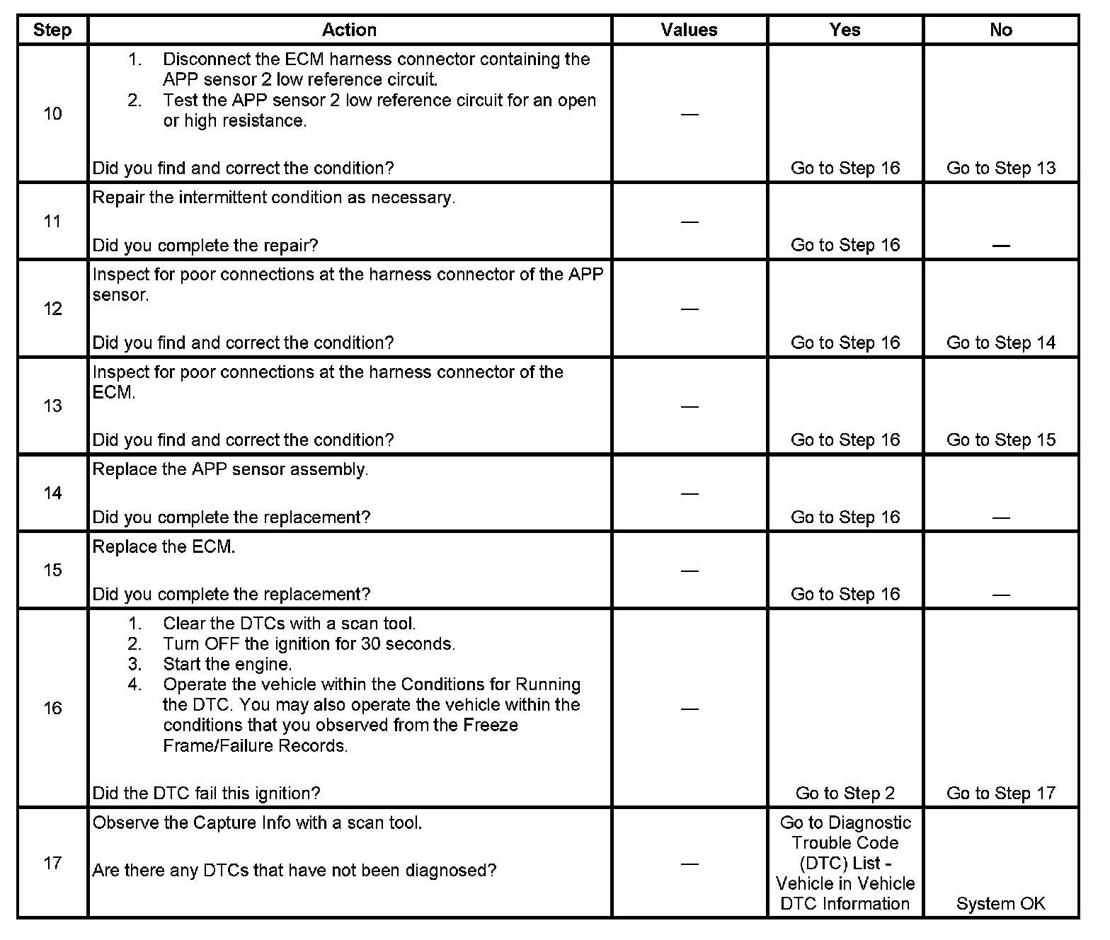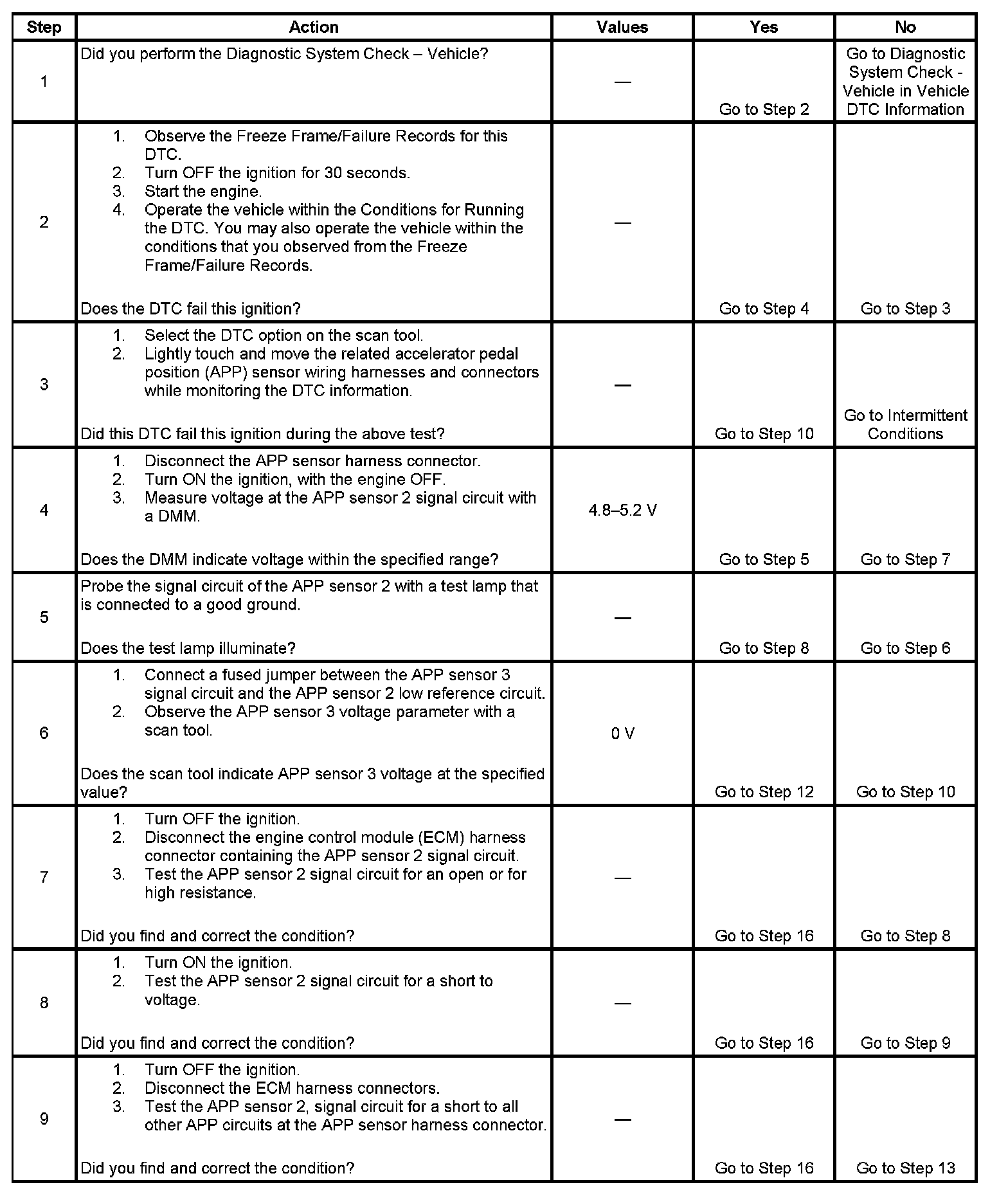 The accelerator pedal position (APP) sensor is mounted on the accelerator pedal control assembly. The sensor is made up of 3 individual sensors within 1 housing. Three separate signal, low reference, and 5-volt reference circuits are used in order to interface the APP sensor with the engine control module (ECM). Each sensor has a unique functionality to determine the pedal position as shown in the table. The ECM uses the APP sensor to determine the amount of acceleration or deceleration desired by the person driving the vehicle via the fuel injector control. If the ECM determines high voltage with the APP sensor 2 circuit, DTC P2128 sets.