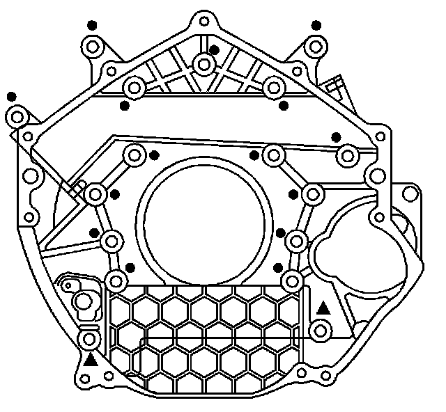 7. Install the flywheel housing bolts, denoted by the black circles.