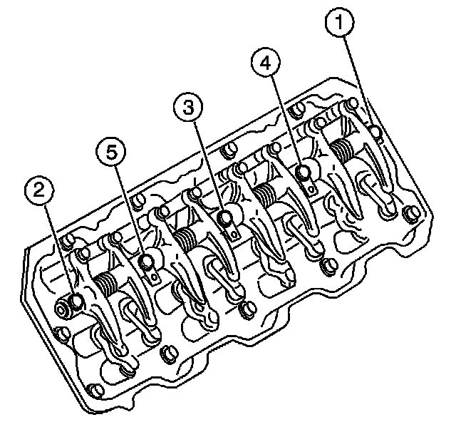 4. Remove the rocker arm shaft assembly bolts in the sequence shown. Leave the bolts in the rocker arm shaft brackets.