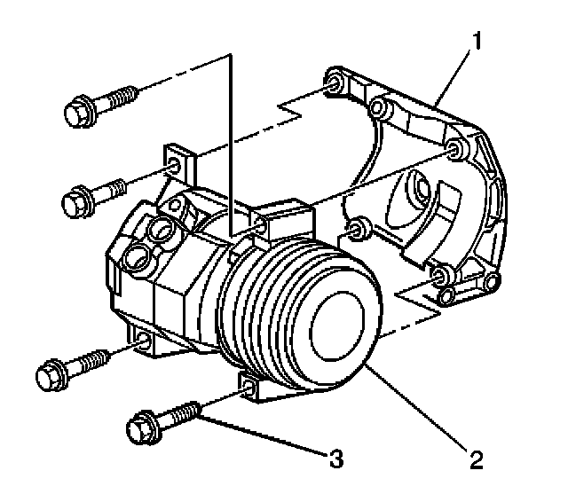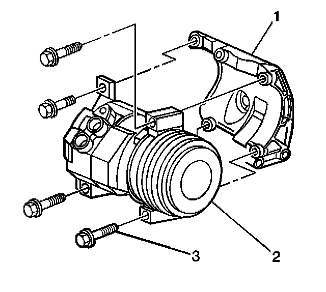 1. Install the A/C compressor (2) to the bracket (1) through the fender well. Insert the mounting bolt (3) into the lower right mounting boss before installing the A/C compressor.