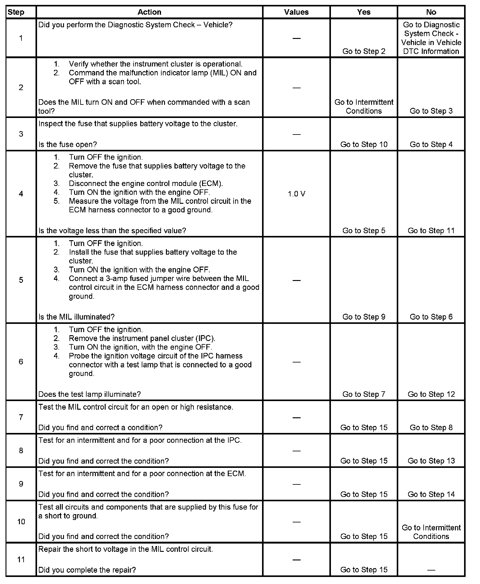 4. This step tests for a short to voltage on the MIL control circuit. With the fuse removed there should be no voltage on the MIL control circuit.