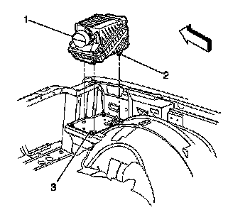 3. Grasp the air filter assembly (1) and pull up on the assembly in order to disengage the retaining pins (2) from the grommets (3).