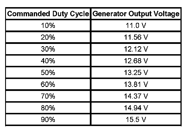 The generator battery control module controls the generator through the generator field control circuit. It monitors the generator performance though the generator field duty cycle signal circuit and the battery positive voltage circuit. The generator battery control module controls the generator through the generator field control circuit. The signal is a 5-volt pulse width modulation (PWM) signal of 128 Hz with a duty cycle of 0-100 percent. Normal duty cycle is between 5-95 percent. Between 0-5 percent and 95-100 percent are for diagnostic purposes. The table shows the commanded duty cycle and output voltage of the generator: