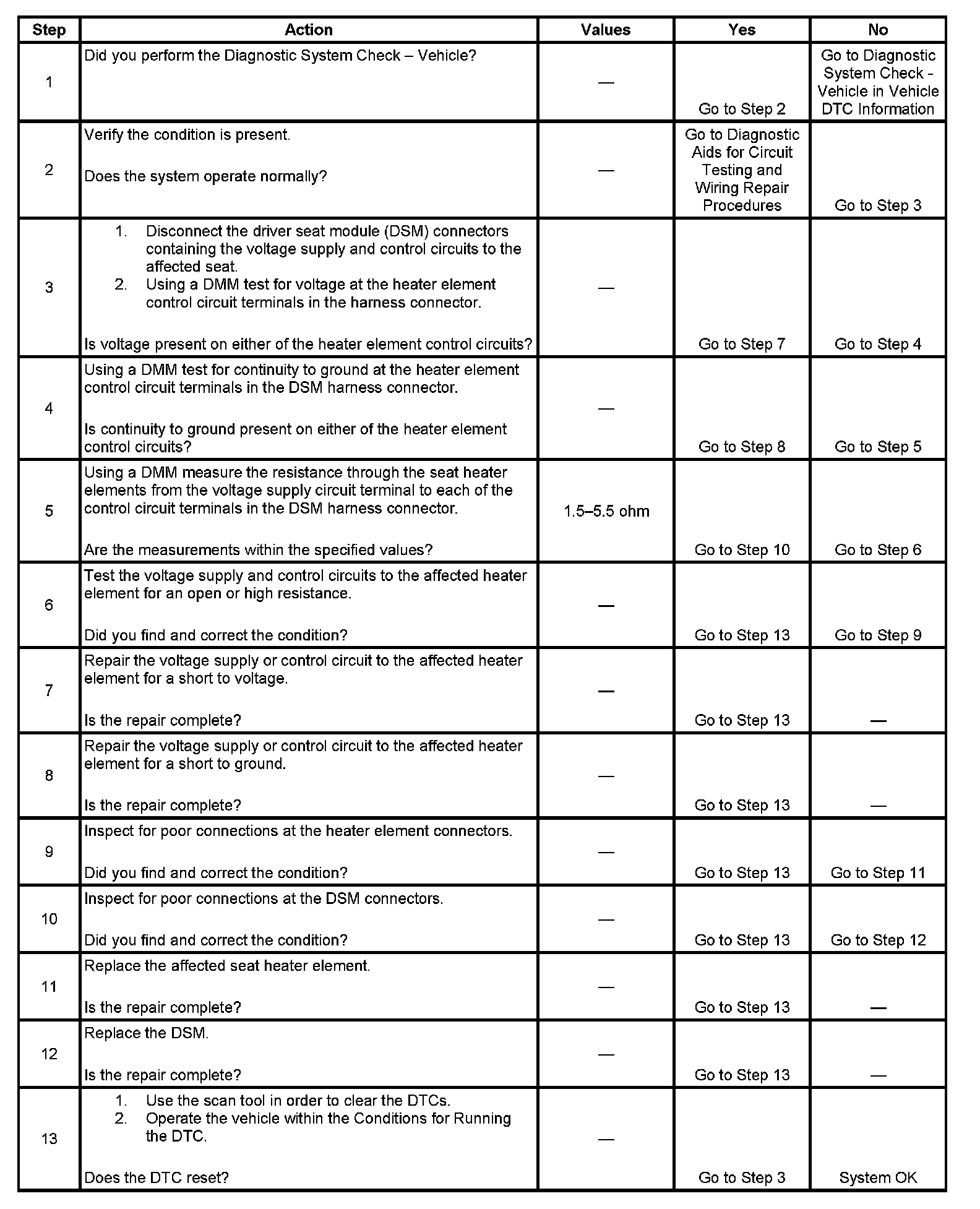 The DSM determines by monitoring the heater element control circuits that a short to voltage, short to ground, or open condition exists.
