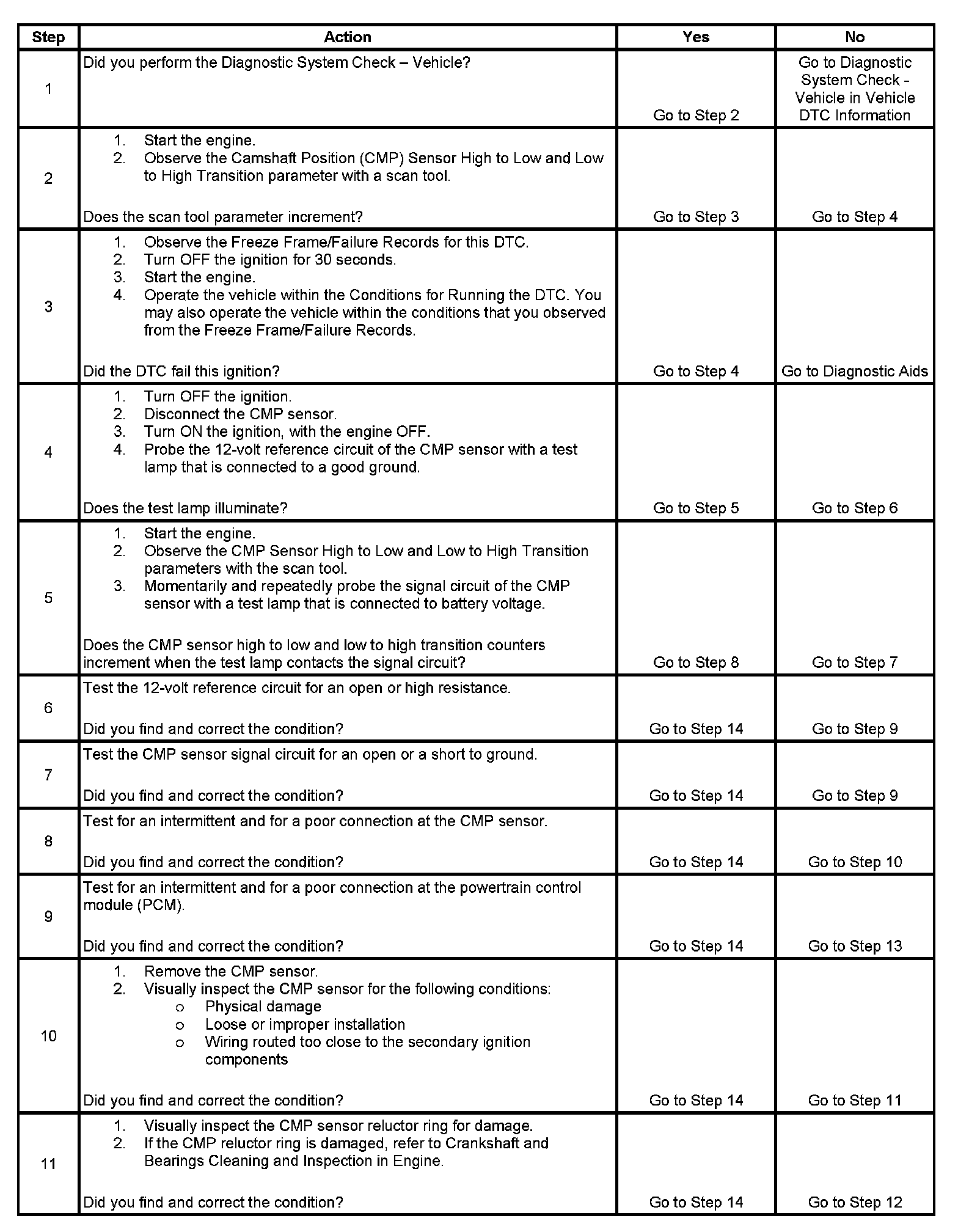 5. This step tests the CMP sensor signal circuit. Applying a voltage causes the CMP Sensor High to Low and Low to High parameter to increase if the circuit and the PCM are operating properly.