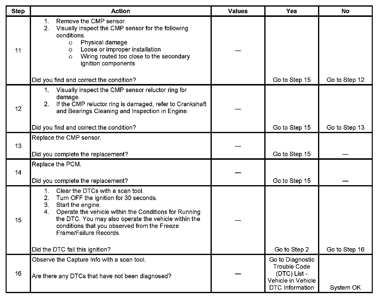 The CMP sensor 1 X signal is used by the PCM to determine if the cylinder at top dead center (TDC) is on the firing stroke or the exhaust stroke. The PCM can determine TDC for all cylinders by using the crankshaft position (CKP) sensor 24 X signal alone. The engine will start without a CMP signal as long as the PCM receives the CKP sensor 24 X signal. A slightly longer cranking time may be a symptom of this condition. The system attempts synchronization and looks for an increase in engine speed indicating that the engine started. If the PCM does not detect an increase in engine speed, the PCM assumes that the PCM incorrectly synchronized to the exhaust stroke and re-syncs to the opposite cam position. If the PCM detects that the CMP signal is constantly high, DTC P0343 sets.