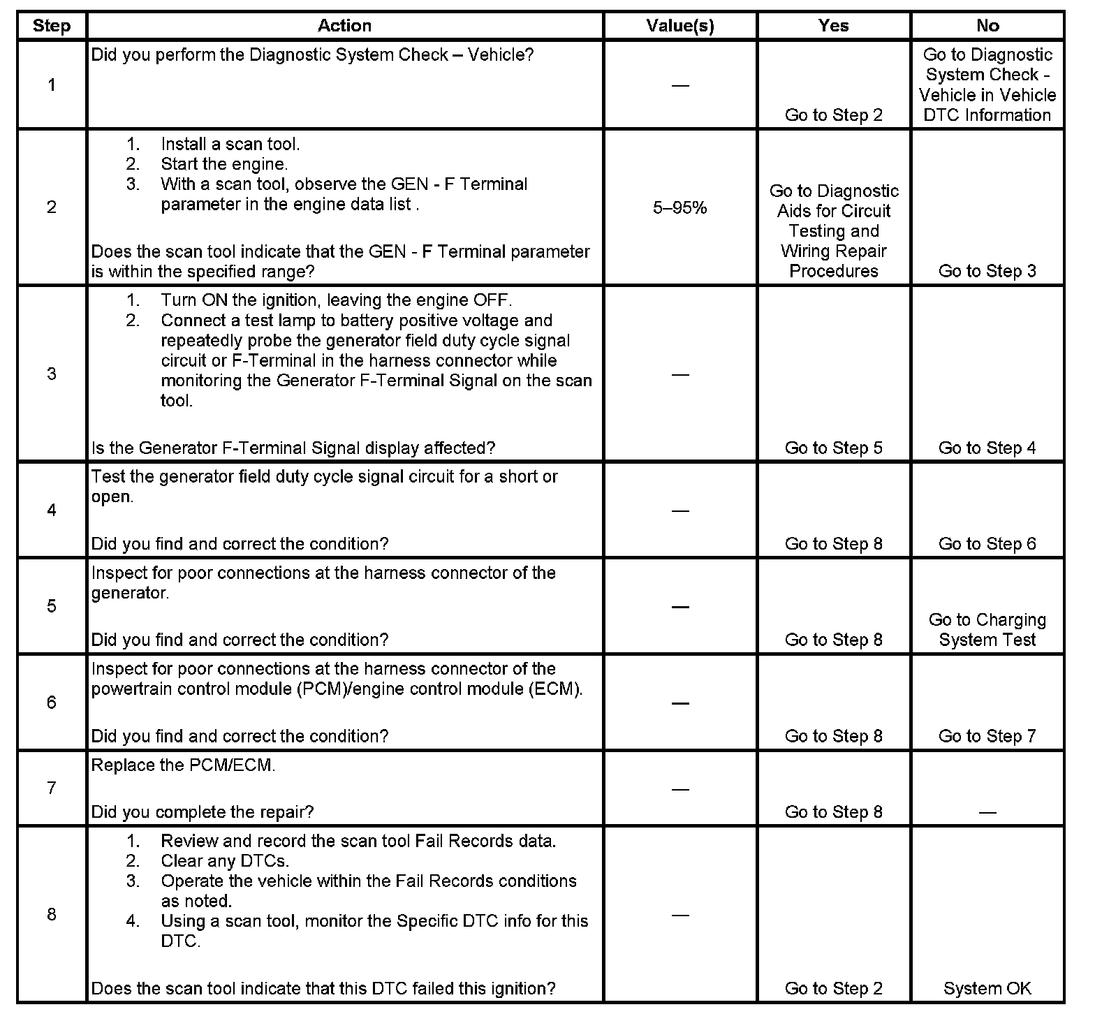 The ECM monitors the state of the generator field duty cycle signal circuit. When the key is in the RUN position and the engine is OFF, the ECM should detect a duty cycle near 0 percent. However, when the engine is running, the duty cycle should be between 5 percent and 100 percent. The ECM monitors the PWM signal using a key ON test and a RUN test. During the tests, if the ECM detects an out of range PWM signal, DTC P0622 will set. When the DTC sets, the ECM will send a class 2 serial data message to the instrument panel cluster (IPC) to illuminate the charge indicator.