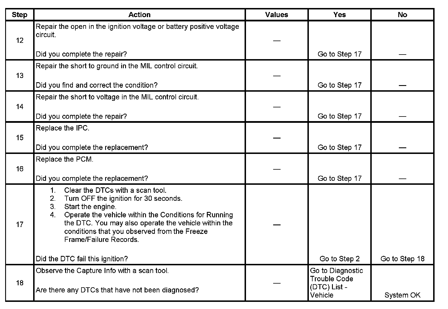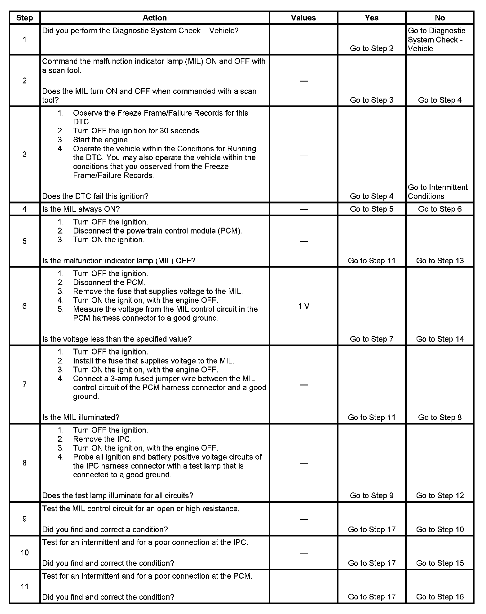 5. This step tests for a short to ground in the MIL control circuit. With the powertrain control module (PCM) disconnected and the ignition ON, the MIL should be OFF.