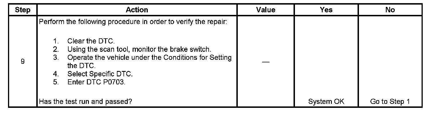 DTC P0703 sets when the vehicle accelerates 10 times with the brake switch in the ON position, or decelerates 10 times with the brake switch in the OFF position.