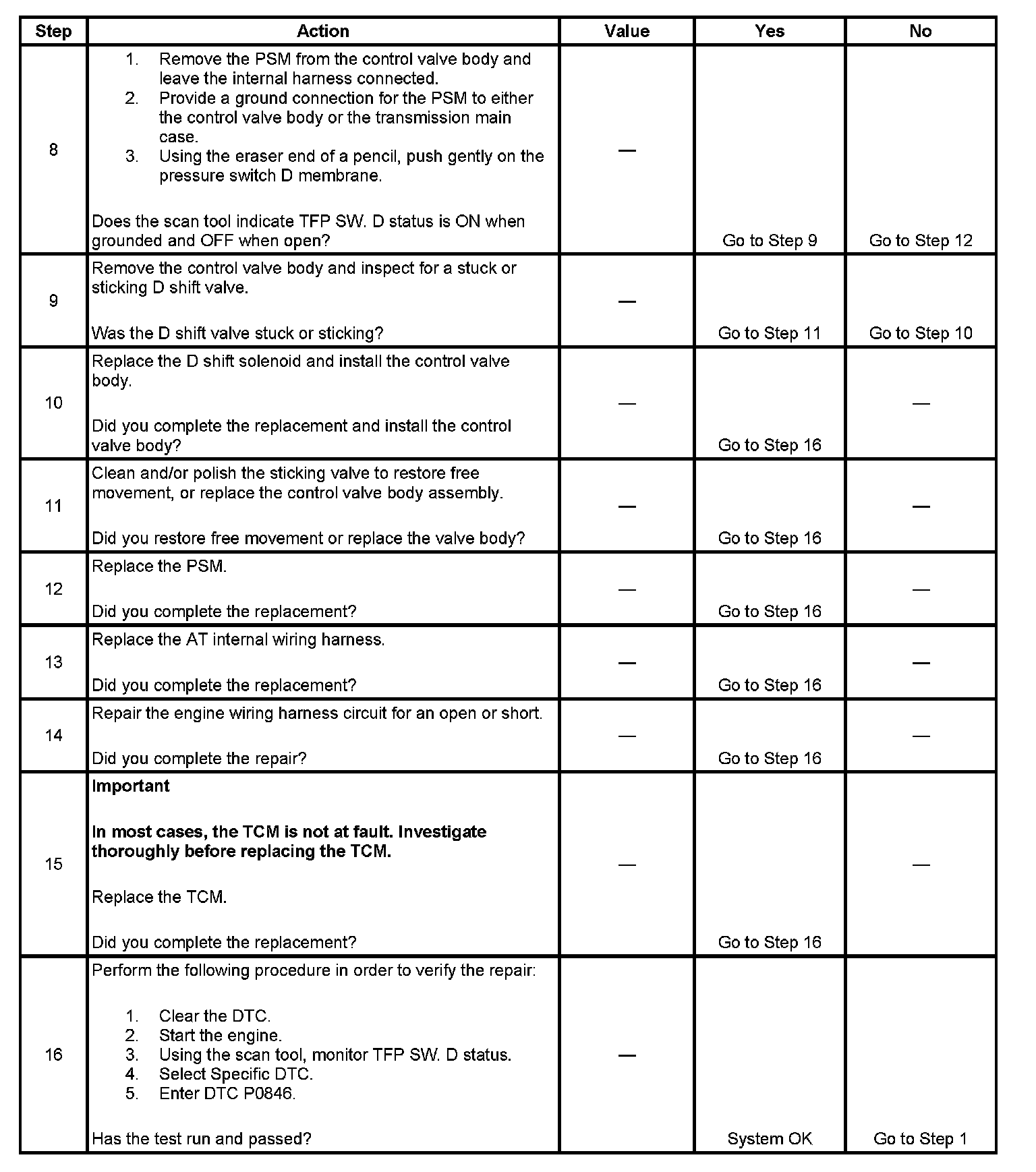 DTC P0846 sets when D solenoid is commanded ON and pressure switch D remains OFF for 5 seconds, depending on fluid temperature.