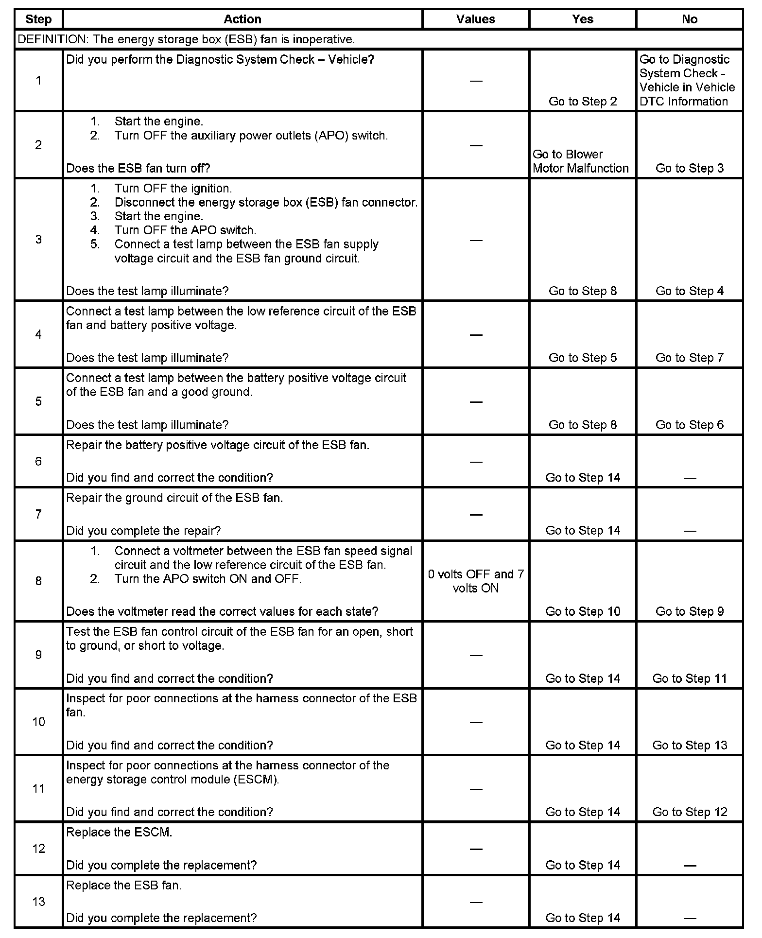 The following DTCs are for the energy storage box (ESB) fan located in the energy storage box: