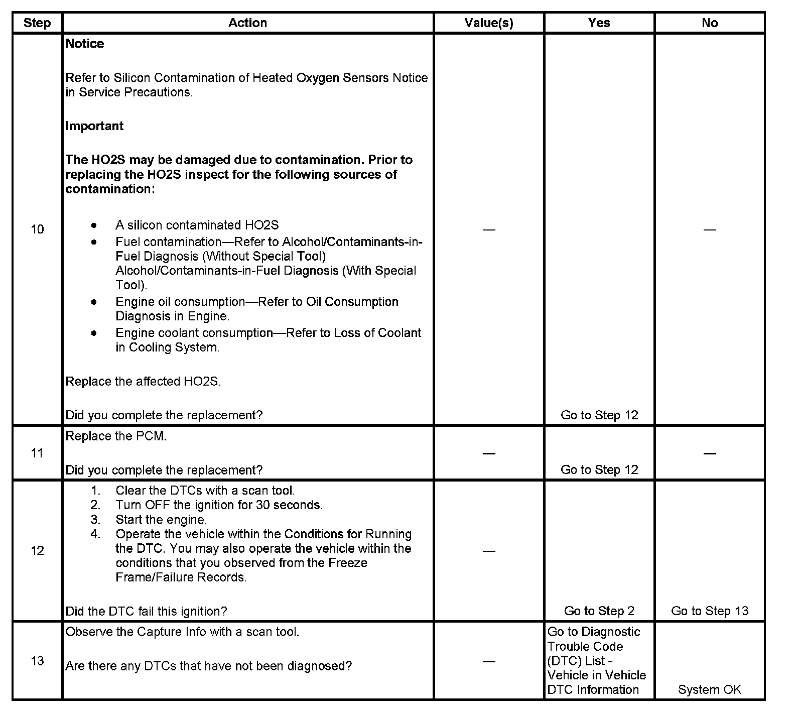 Heated oxygen sensors (HO2S) are used for fuel control and post catalyst monitoring. Each HO2S compares the oxygen content of the surrounding air with the oxygen content in the exhaust stream. The HO2S must reach operating temperature to provide an accurate voltage signal. Heating elements inside the HO2S minimize the time required for the sensors to reach operating temperature. The powertrain control module (PCM) supplies the HO2S with a reference, or bias, voltage of about 450 mV. When the engine is first started the PCM operates in open loop, ignoring the HO2S voltage signal. Once the HO2S reaches operating temperature and closed loop is achieved, the HO2S generates a voltage within a range of 0-1,000 mV that fluctuates above and below bias voltage. High HO2S voltage indicates a rich exhaust stream; low HO2S voltage indicates a lean exhaust stream. This diagnostic will only run once per ignition cycle. The PCM monitors the rich-to-lean and lean-to-rich transition time. A transition is defined as, the HO2S voltage changes from above 625 mV to below 250 mV or from below 250 mV to above 625 mV. If the PCM detects that the difference between the rich-to-lean average transition time and lean-to-rich average transition time is more than a specified value, DTC P1134 sets for HO2S bank 1 sensor 1, or DTC P1154 sets for HO2S bank 2 sensor 1.