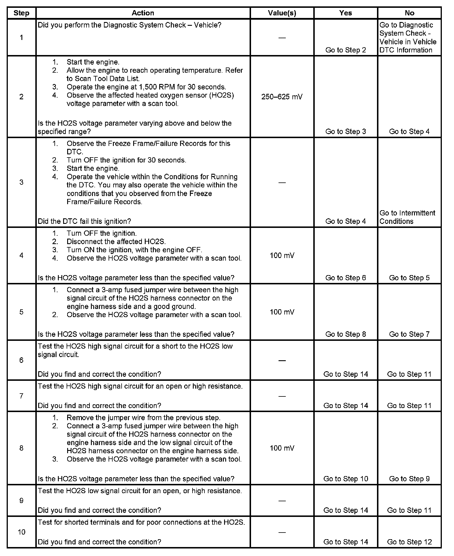 Heated oxygen sensors (HO2S) are used for fuel control and post catalyst monitoring. Each HO2S compares the oxygen content of the surrounding air with the oxygen content in the exhaust stream. The HO2S must reach operating temperature to provide an accurate voltage signal. Heating elements inside the HO2S minimize the time required for the sensors to reach operating temperature. The powertrain control module (PCM) supplies the HO2S with a reference, or bias, voltage of about 450 mV. When the engine is first started the PCM operates in open loop, ignoring the HO2S voltage signal. Once the HO2S reaches operating temperature and closed loop is achieved, the HO2S generates a voltage within a range of 0-1,000 mV that fluctuates above and below bias voltage. High HO2S voltage indicates a rich exhaust stream; low HO2S voltage indicates a lean exhaust stream. This diagnostic will only run once per ignition cycle. The PCM monitors the number of rich-to-lean and lean-to-rich transitions. If the PCM detects that the number of transitions were less than a specified value, DTC P1133 sets for HO2S bank 1 sensor 1, or DTC P1153 sets for HO2S bank 2 sensor 1.