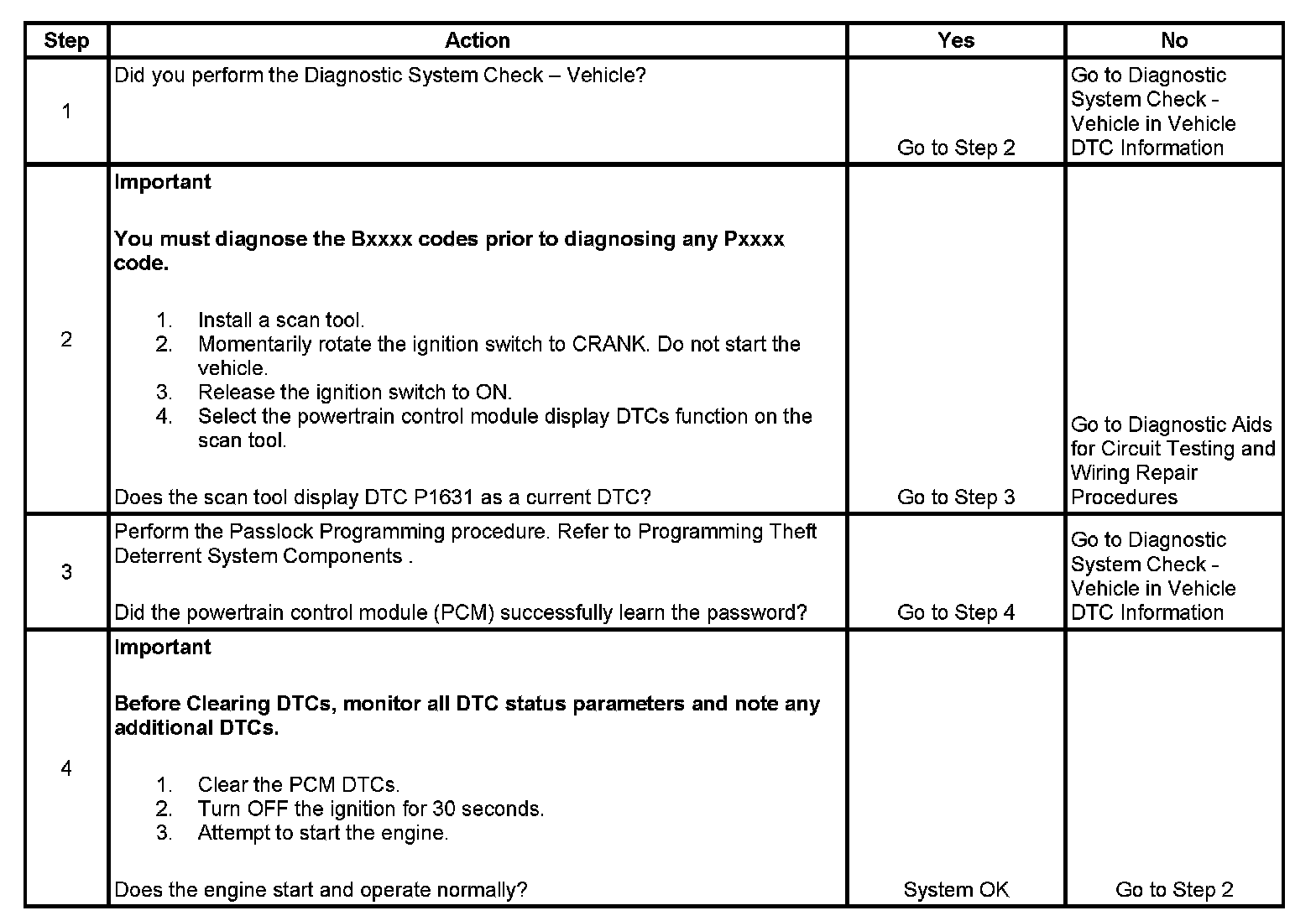 When the Passlock portion of the VTD system has sensed the proper operation of the ignition switch and lock, or determined that the switch and lock have not been tampered with, the BCM transmits a password to the PCM. Fuel delivery is enabled if this password matches the password stored in the modules memory. If a component in the theft deterrent system has been replaced, the modules need to relearn the password of the new components. If the relearn procedure was not performed, this DTC will set.