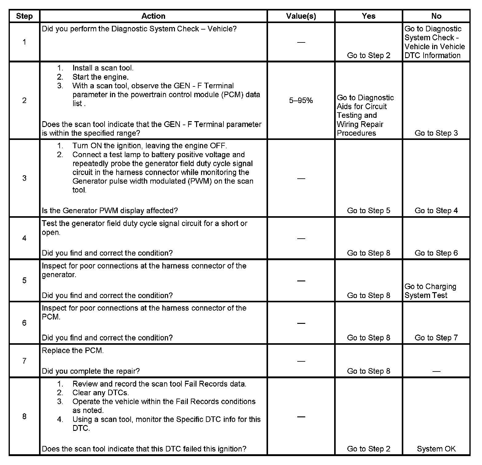 The powertrain control module (PCM) uses the generator field duty cycle signal circuit to monitor the duty cycle of the generator. The generator field duty cycle signal circuit connects to the high side of the field winding in the generator. A pulse width modulated (PWM) high side driver in the voltage regulator turns the field winding ON and OFF. The PCM uses the PWM signal input to determine the generator load on the engine. This allows the PCM to adjust the idle speed to compensate for high electrical loads.