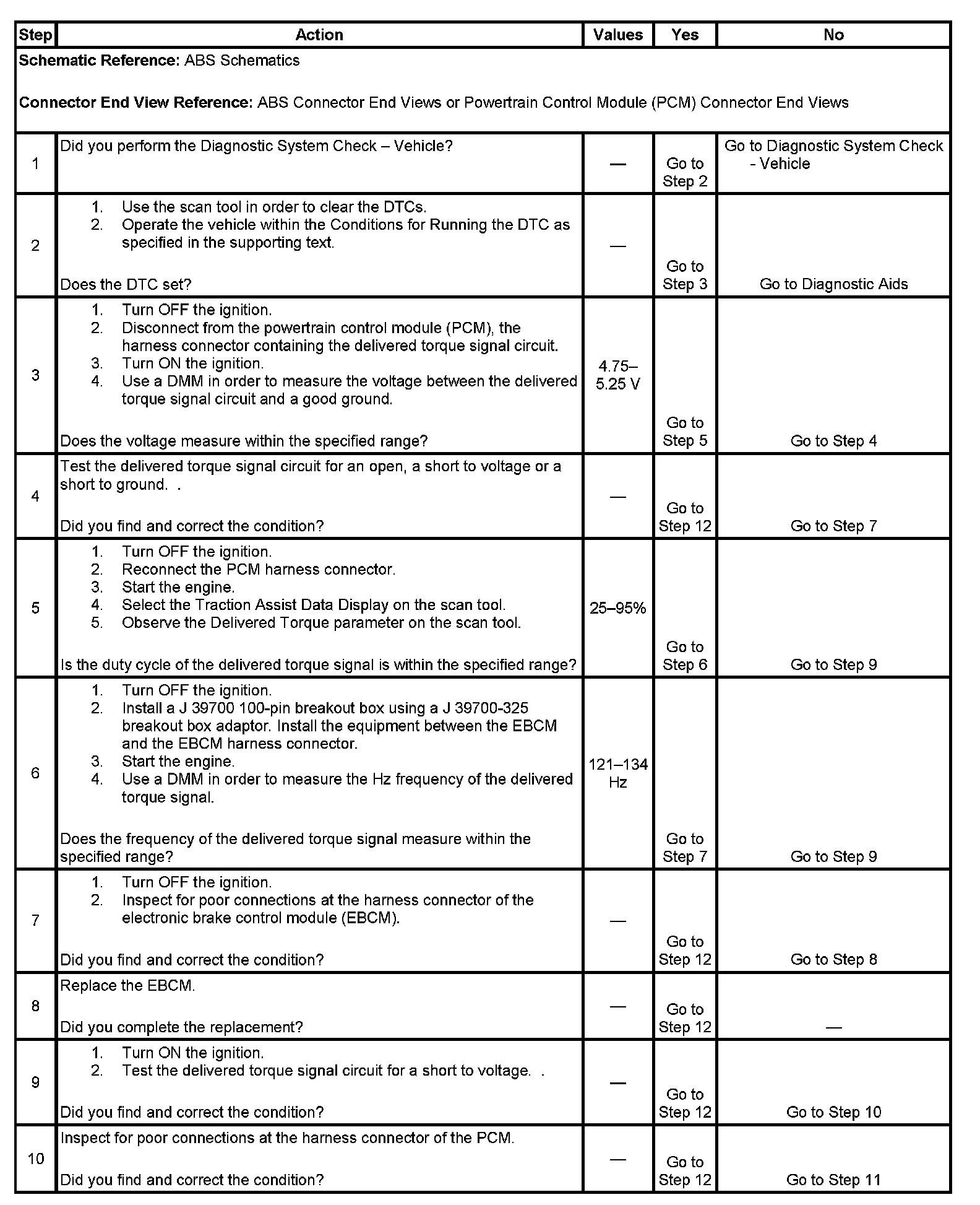 The EBCM supplies 5 VDC to the Powertrain Control Module (PCM) on the delivered torque signal circuit. The PCM toggles this voltage to ground in order to create the delivered torque signal at the EBCM. A signal with a frequency of 128 Hz 5 percent and a duty cycle of 25-95 percent is a valid delivered torque signal. The percentage of duty cycle is proportionate to the percentage of delivered torque.
