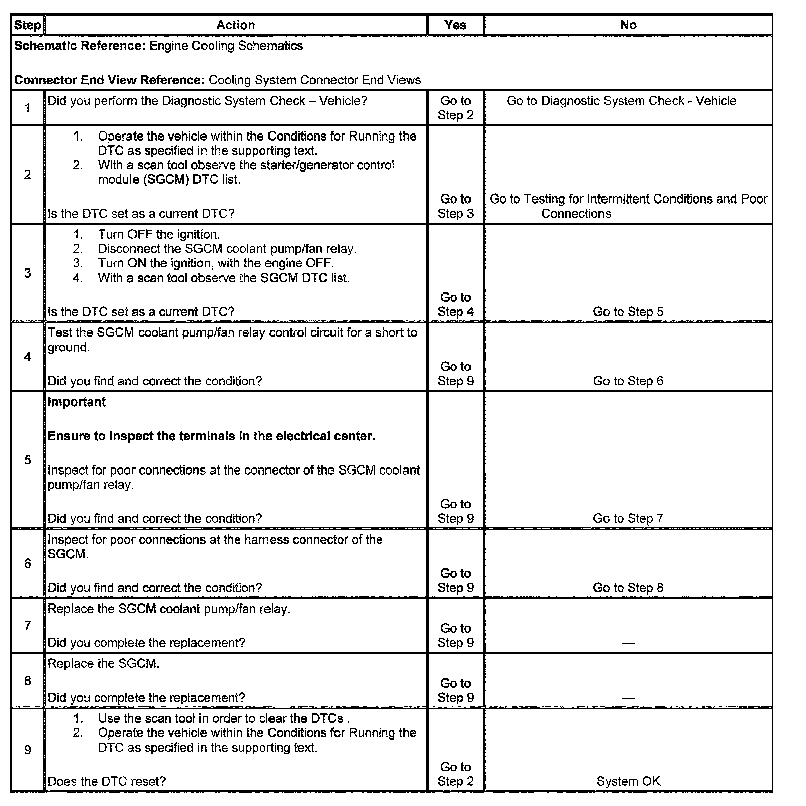 The Starter/Generator Control Module (SGCM) coolant pump/fan relay supplies battery voltage to the SGCM coolant pump relay and the SGCM coolant fan relay. The SGCM monitors the temperature of the low side driver for the SGCM coolant pump/fan relay. The temperature sensor of the driver is not serviceable and the data for this sensor is not available on the scan tool. This internal driver temperature sensor aids in detecting a control circuit shorted to ground or a shorted relay coil.