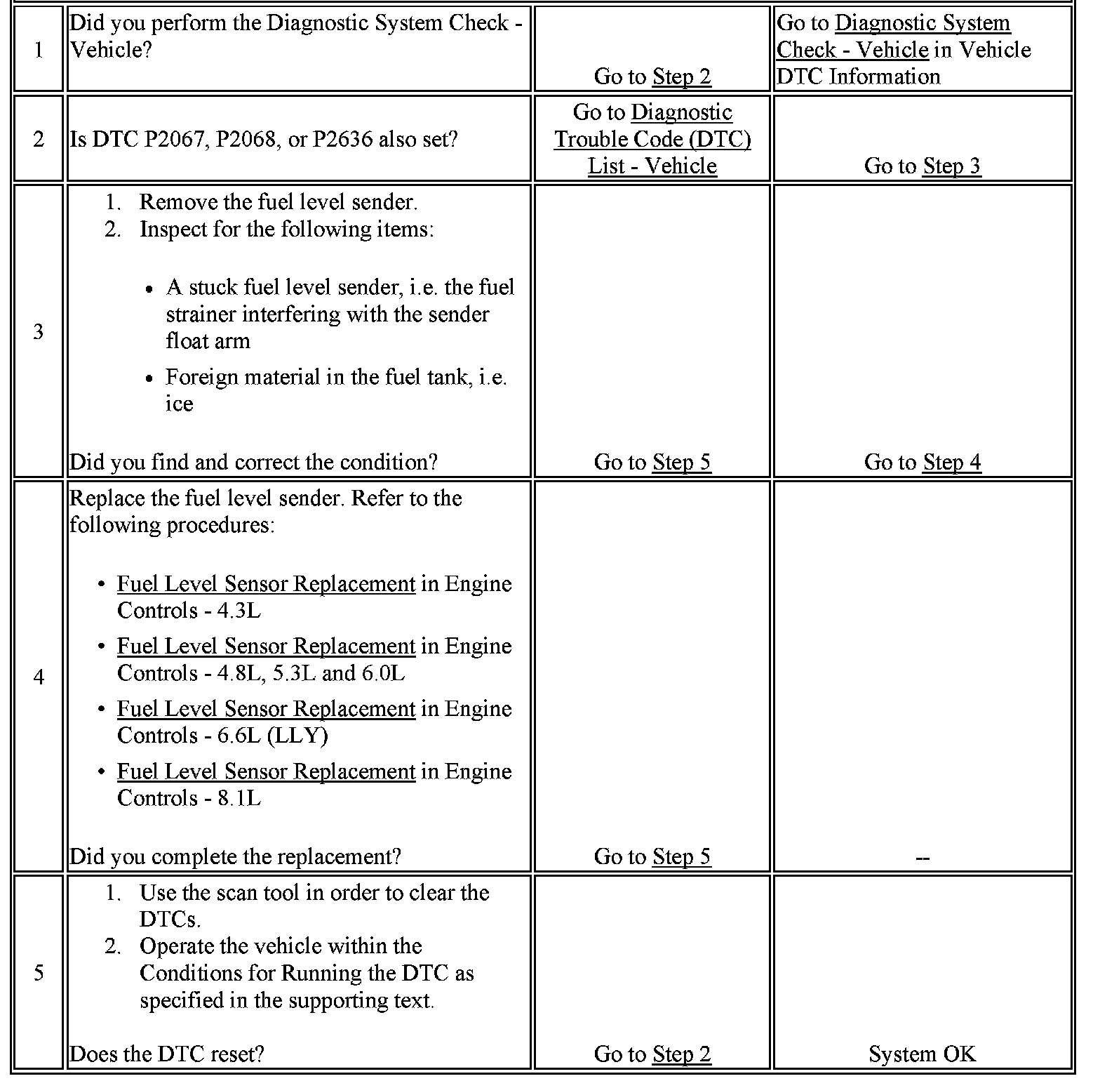 The primary fuel level sender and the secondary fuel level sender changes resistance based on fuel level. The powertrain control module (PCM) monitors the signal circuits of the primary fuel level sender and the secondary fuel level sender in order to determine the fuel level. When the fuel tank is full, the resistance of both fuel level senders are low and the PCM senses a low signal voltage on both the signal circuits of the primary fuel level sender and the secondary fuel level sender. When the fuel tanks are empty, the resistance of the fuel level senders are high and the PCM senses a high signal voltage. The PCM uses the signal circuits of the primary fuel level sender and the secondary fuel level sender in order to calculate the percentage of remaining fuel in the tank. The PCM sends the fuel level percentage via the class 2 serial data circuit to the instrument cluster in order to control the fuel gage. The fuel level information is also used for misfire and evaporative emissions (EVAP) diagnostics.