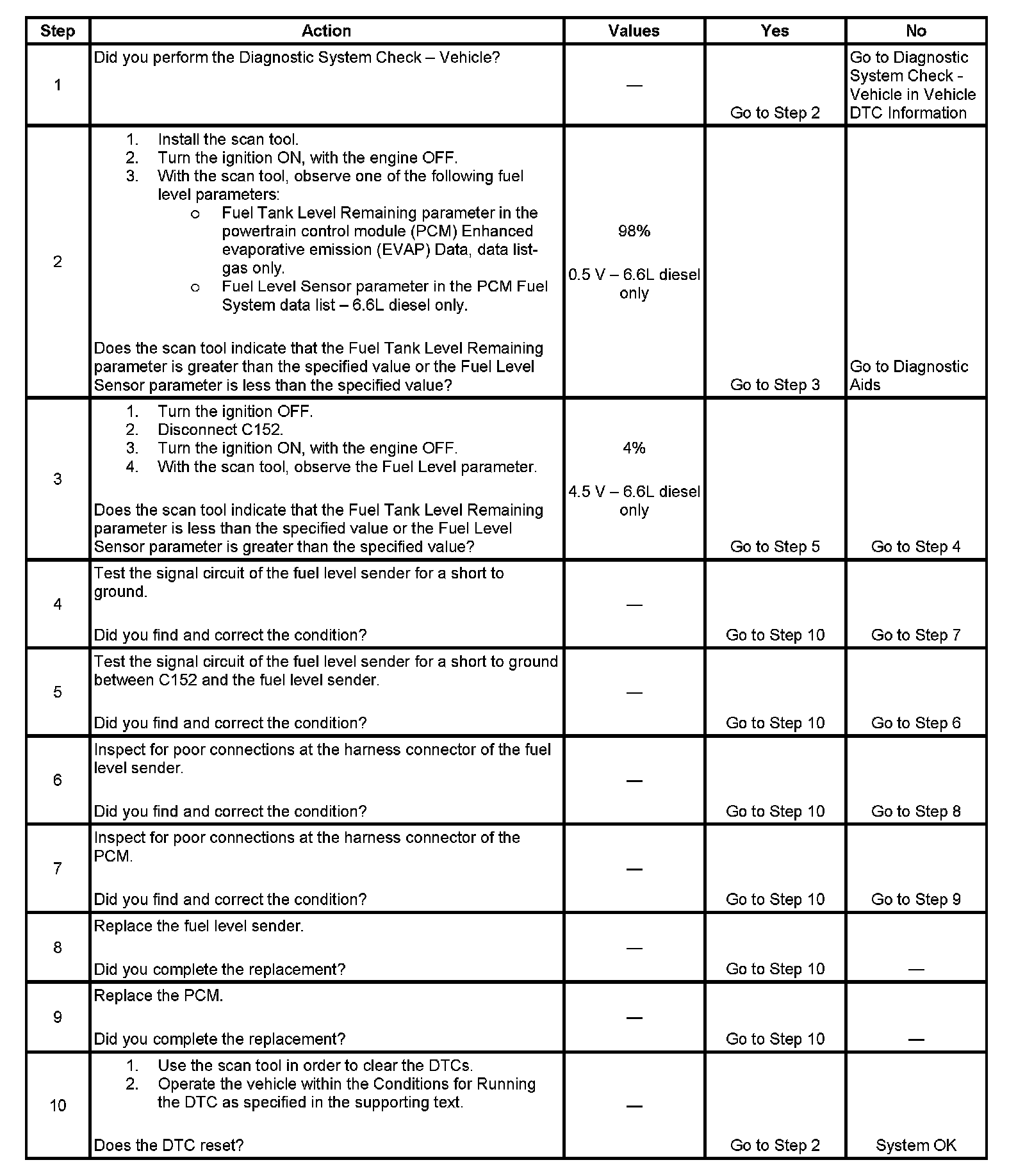 This diagnostic tests for a lower than normal secondary fuel level sender signal.