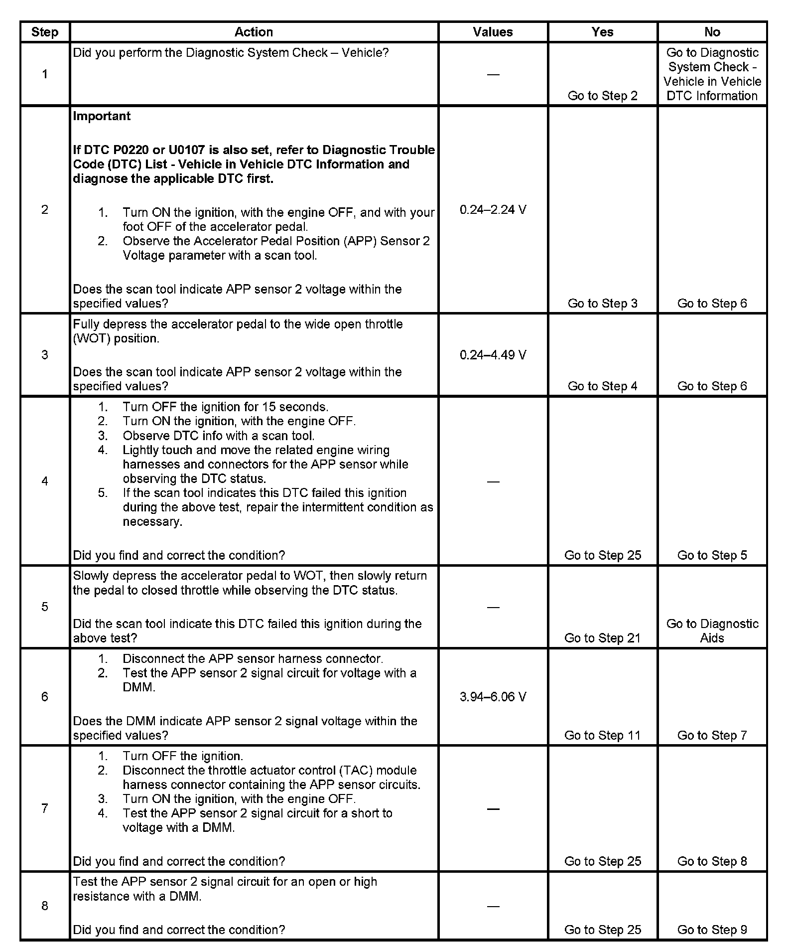 2. The throttle position (TP) sensor 2 and the APP sensor 2 share a common 5-volt reference source. Diagnose DTC P0220 first if P0220 is also set.