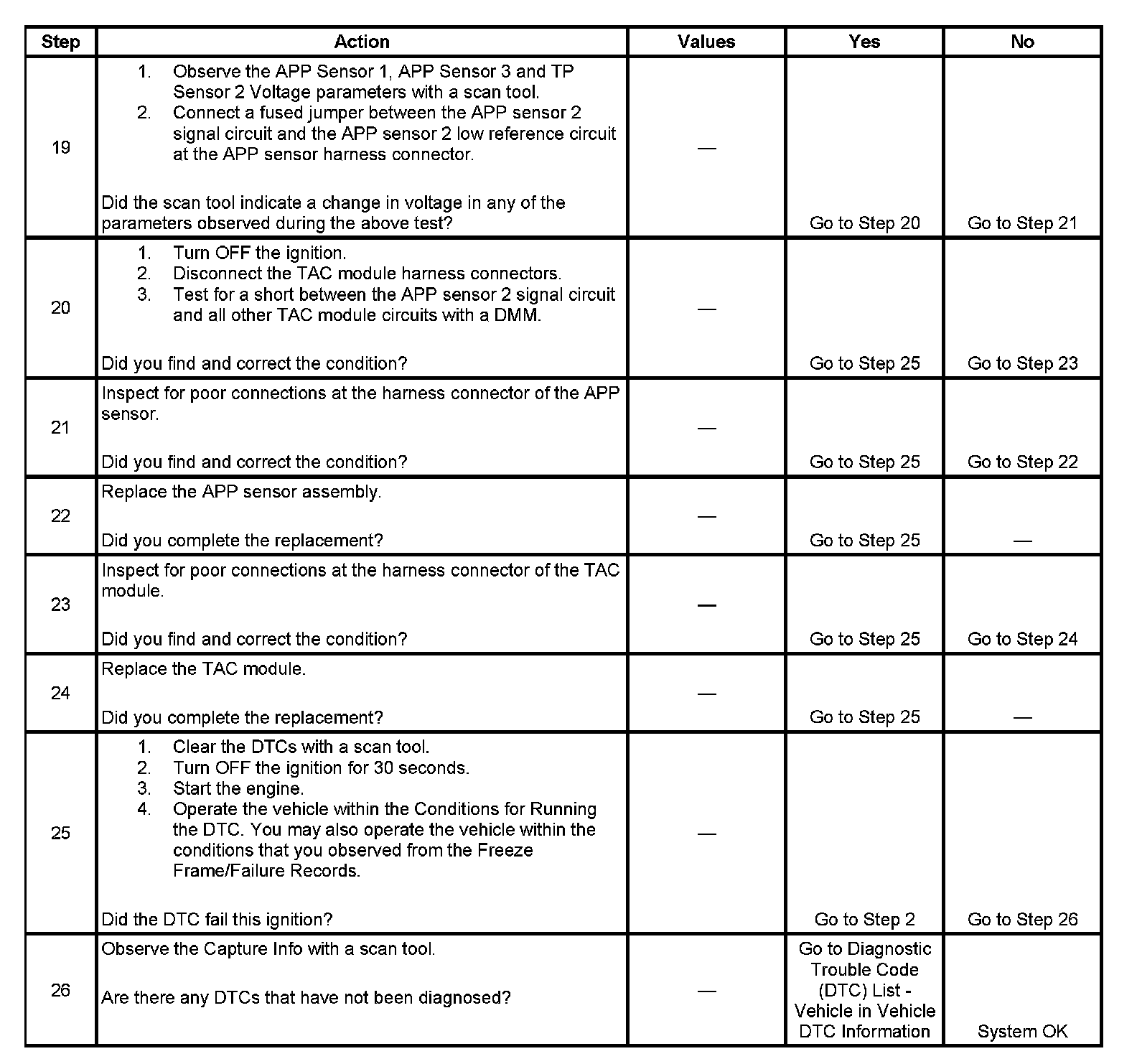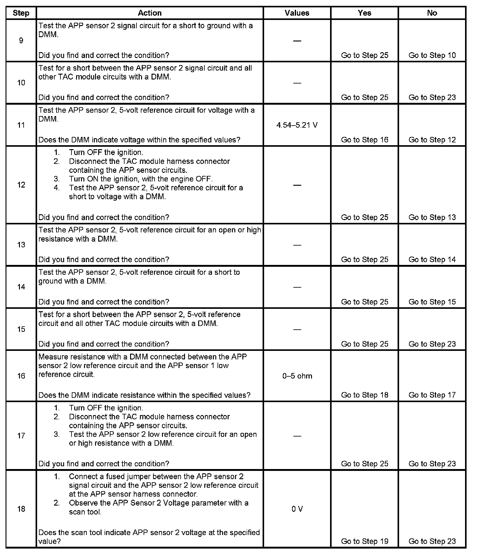 19. There are 2 separate 5-volt reference sources within the TAC module. The TP sensor 1 and the APP sensor 1 share one 5-volt reference source. The TP sensor 2 and the APP sensor 2 share another common 5-volt reference source. This test determines whether the signal circuit is shorted to any one of the 5-volt reference circuits. If a short exists, the corresponding sensor voltage will be pulled low.