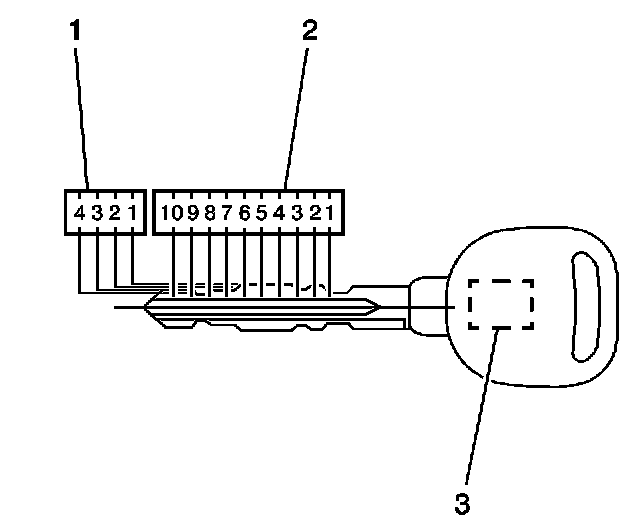 You can obtain the key code from the 4-digit number on the key tag that accompanies the original master and valet keys. The 4-digit key code cross references to the cut and tumbler sequence. The keys have 10 key cut positions (1) and 4 key cut depths (2). Key cut positions are numbered 1-10, counting from the head of the key to the tip. The key cut depths are 1 through 4, cut depth number 1 is the deepest cut. The key transponder (3) in the master and valet key must be programmed to the vehicle. Refer to appropriate service procedure for programing the keys to the vehicle.
