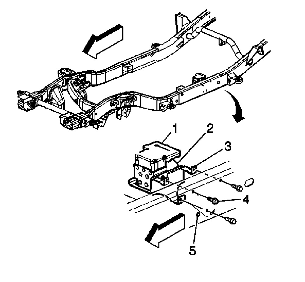 5. Remove the bolts (4) securing the EHCU mounting bracket (3) to the frame rail (5).