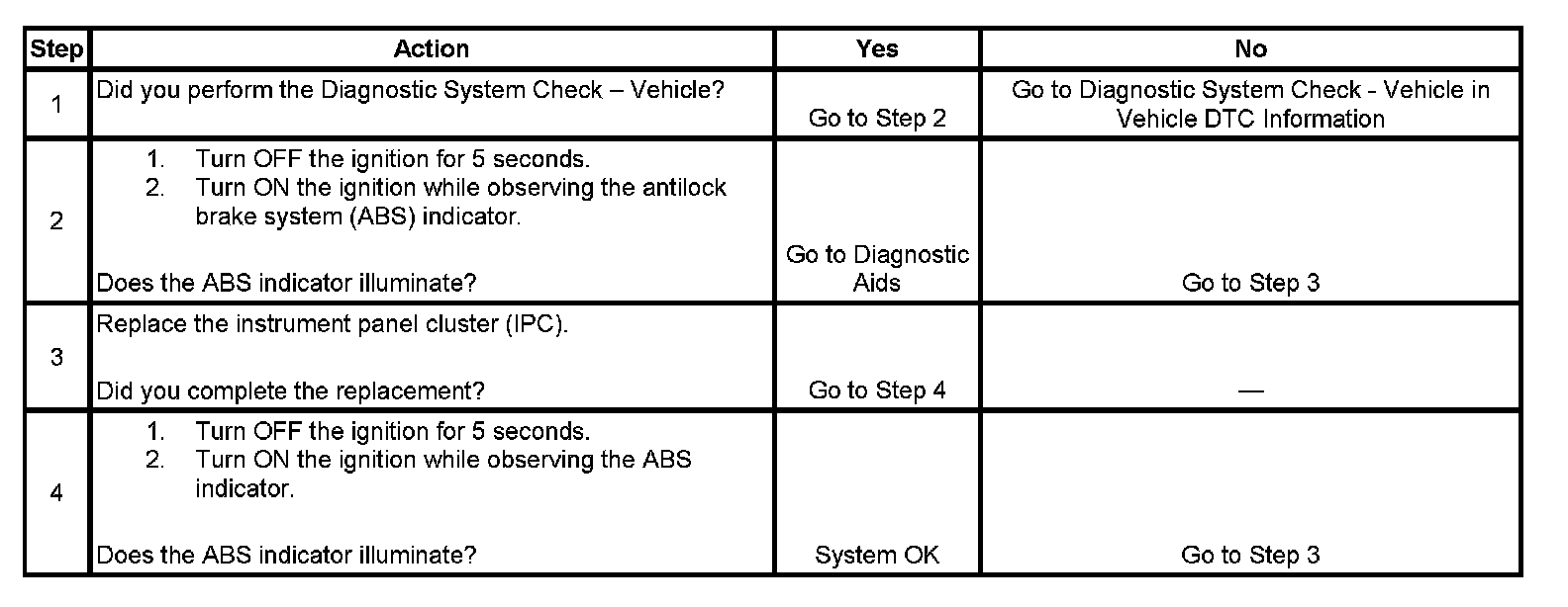 Replace the Instrument Panel Cluster if the ABS indicator intermittently fails to operate during the bulb check.