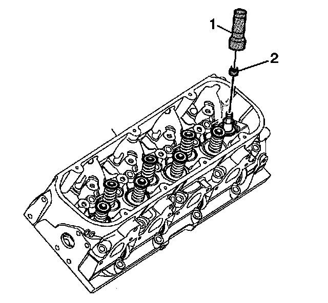 3. Install the valve stem oil seal (2) over the valve tip and onto the valve guide using J43105. Tap the valve stem seal onto the valve guide until the J43105 fully seats the seal.