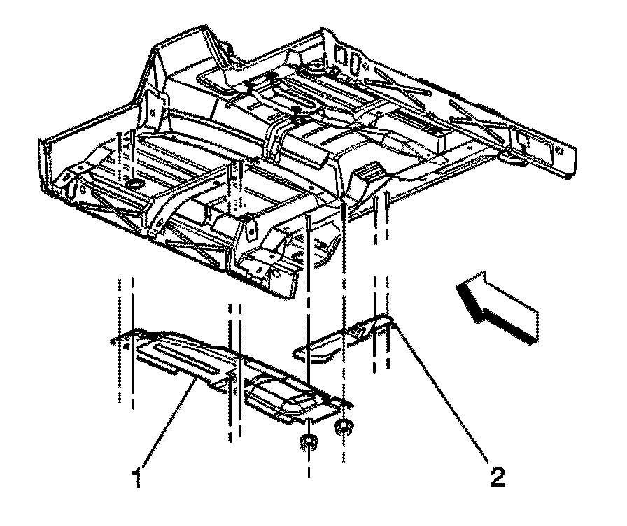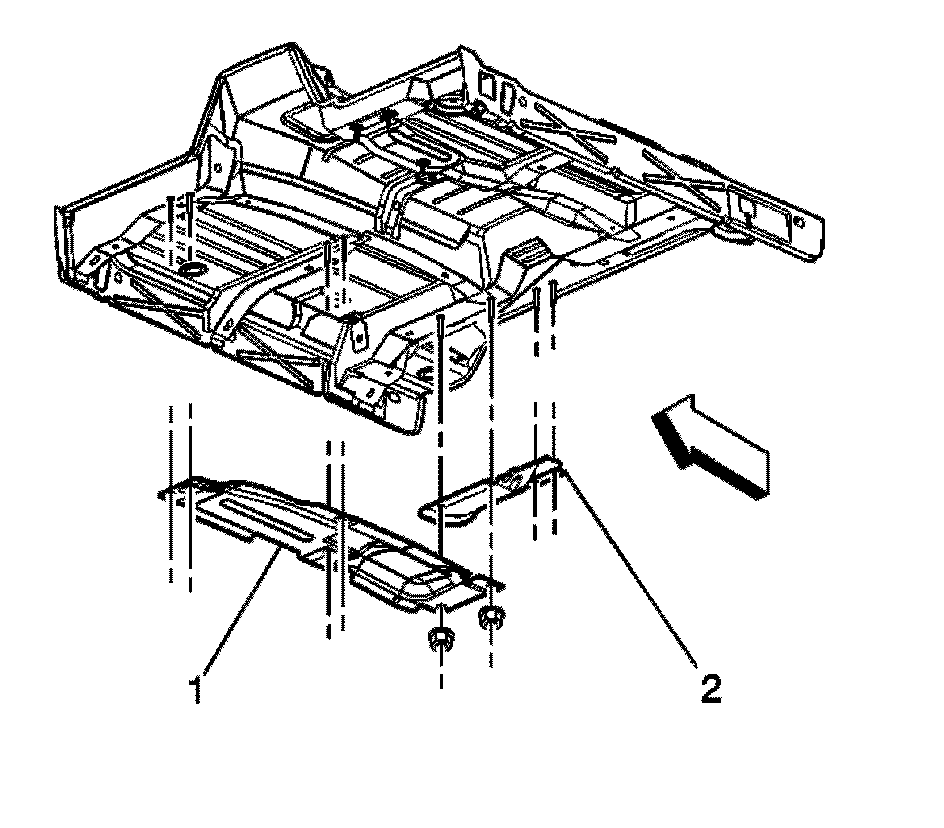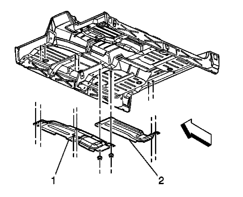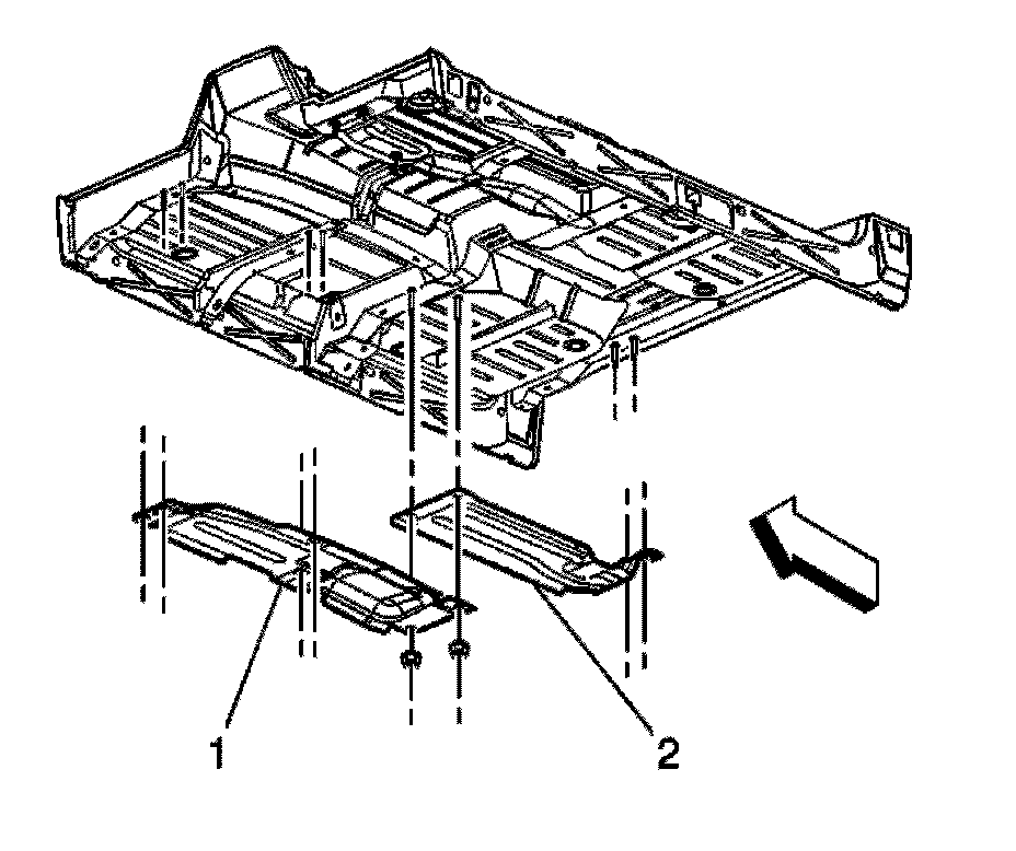 5. If vehicle is a regular cab pick-up truck, install the exhaust front heat shield (1) and/or the exhaust heat shield (2) to the studs.