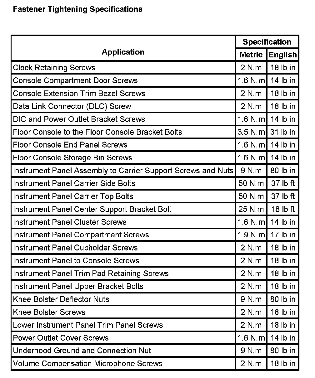 Instrument Panel, Gauges and Warning Indicators: Specifications