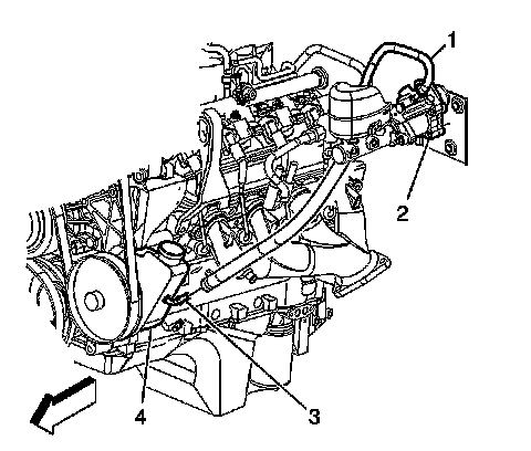 3. Install the brake booster outlet hose to the power steering pump (4). Position the clamp at the end of the hose.
