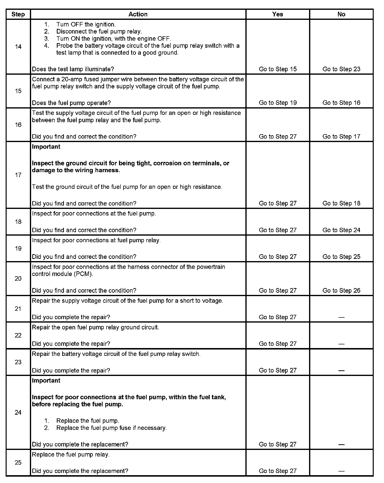 5. This step tests for an open in the ground circuit to the fuel pump relay.