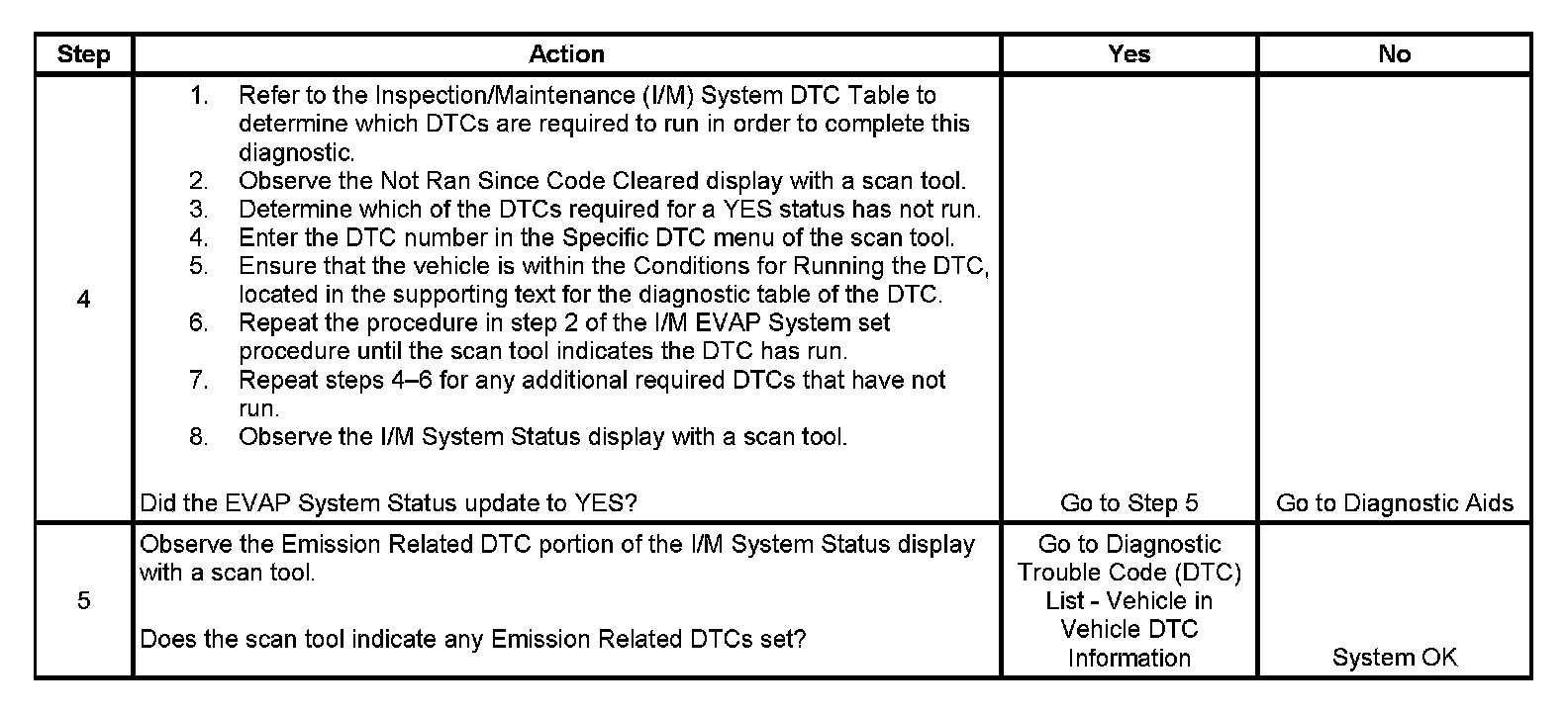 The purpose of this procedure is to satisfy the enable criteria necessary to execute inspection/maintenance (I/M) readiness diagnostics for the Evaporative Emission (EVAP) System. The procedure may be used to set the EVAP I/M System Status display on the scan tool to YES. The EVAP I/M System Status display indicates whether or not the control module has completed the readiness diagnostics. The readiness diagnostics complete when all DTCs comprising the diagnostics run and pass, or any DTC comprising the diagnostics illuminates the malfunction indicator lamp (MIL). If the diagnostics pass during one drive cycle, seventeen hours must elapse, regardless of whether the vehicle is driven or not. Then, the diagnostics will run again during the next drive cycle in which the conditions for running are met. Once the diagnostics have passed during the third drive cycle, the EVAP I/M System Status display will be updated to YES. A failed or aborted diagnostic will require the vehicle to cool down in order to meet the enable criteria for another drive cycle. Therefore, performing a visual inspection prior to running the EVAP test may prevent having to repeat the drive cycle.