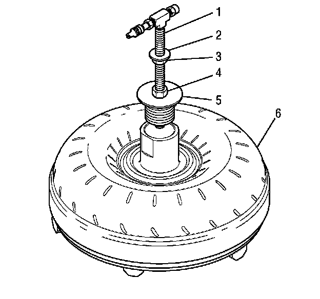 5. Firmly tighten the nut (6) in order to seal J 43763 into the torque converter.