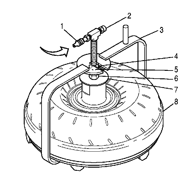 6. Firmly tighten the nut (5) in order to securely attach the torque converter to J 21369-F (3). Connect an air hose to the air fitting (1) of J 43763.
