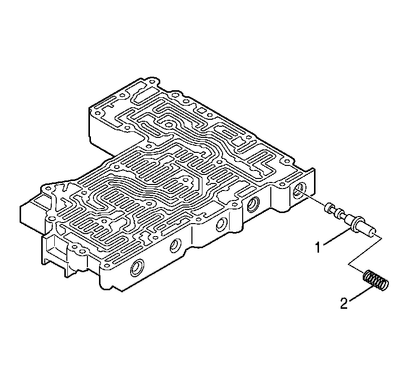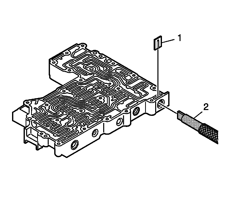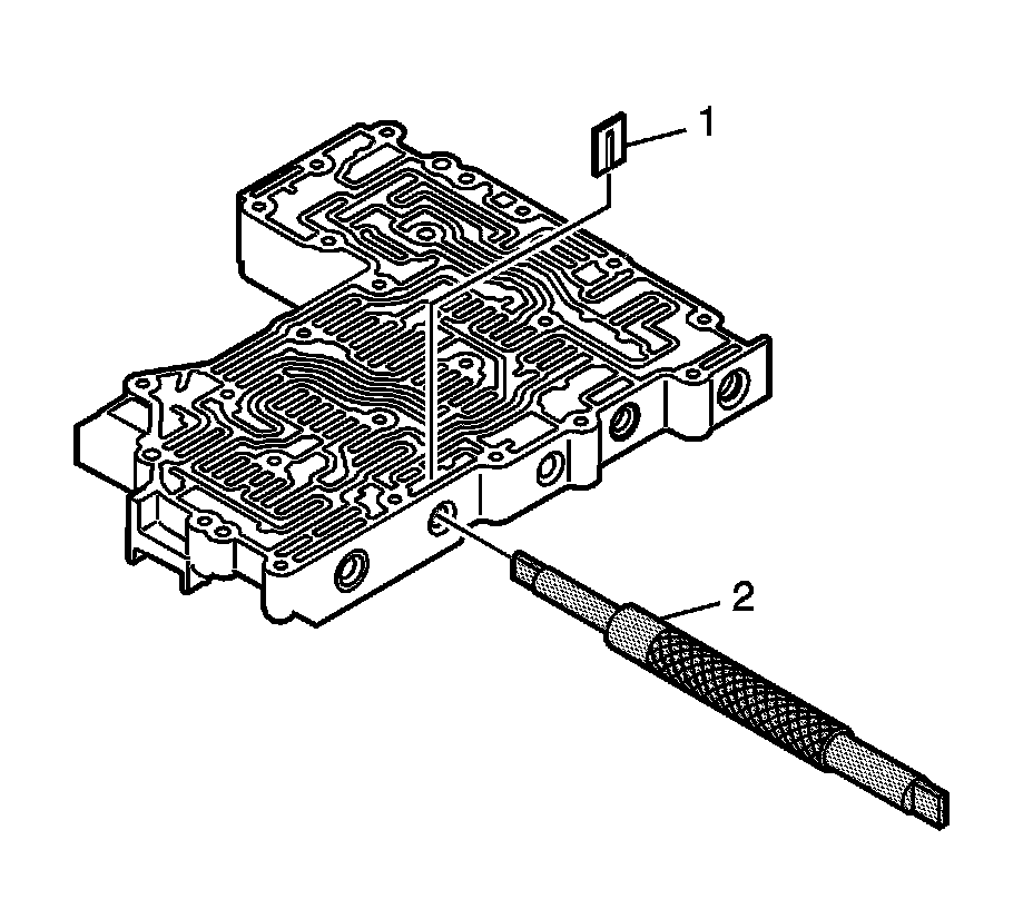 1. Using J 43773 (2) , compress the C shift valve spring until retaining clip (1) is loose. Remove retaining clip (1).