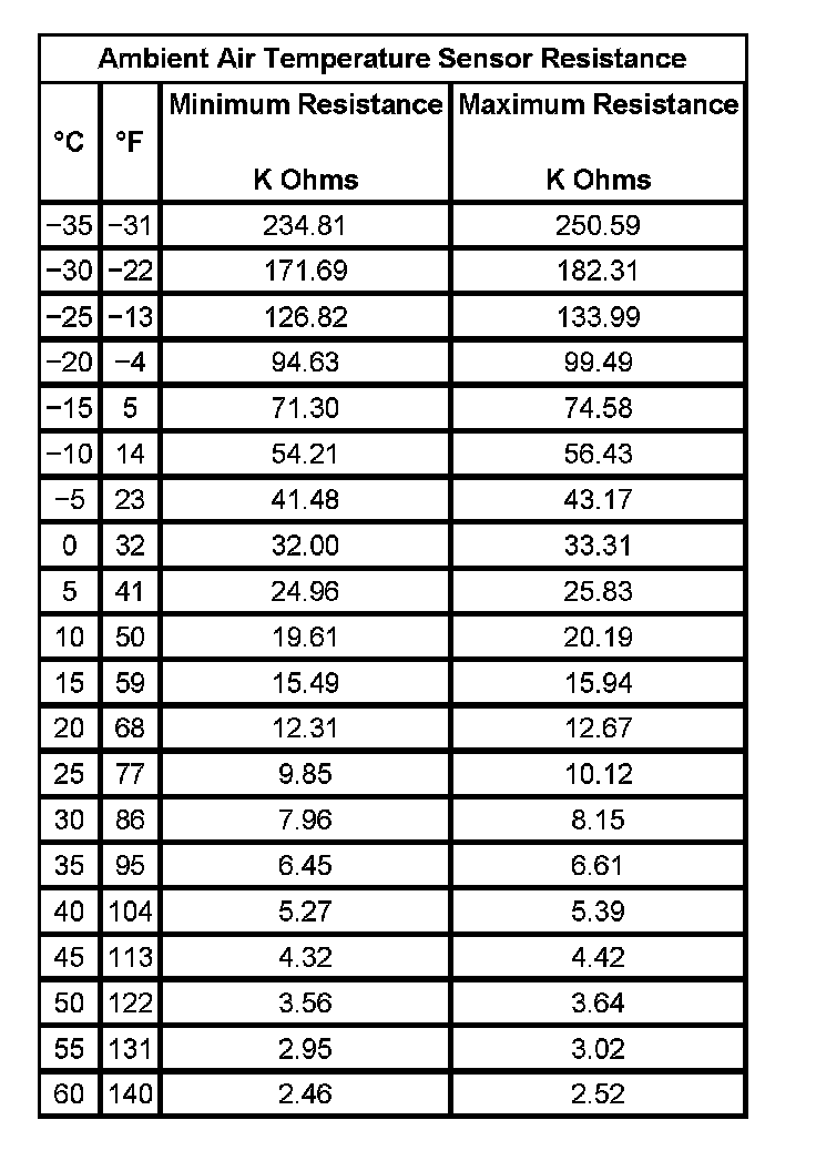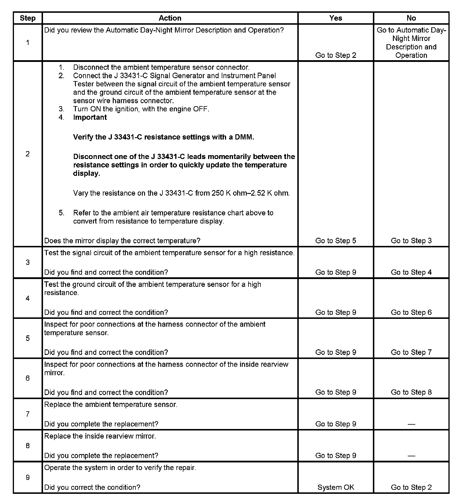 The table will be used to measure the resistance of the sensor and compare it with the actual ambient temperature. The mirror's temperature accuracy should be within 5 degrees of the actual temperature. The actual temperature should not be taken from a radio station, a sign displaying the temperature, etc. A temperature measuring tool such as a thermometer should be used. Some temperature measuring tools may be within 5 degrees of the actual temperature. Make sure to consult the manufacturer for the accuracy of the tool. This comparison can make the mirror seem off by 5-10 degrees of the actual temperature when it is not.