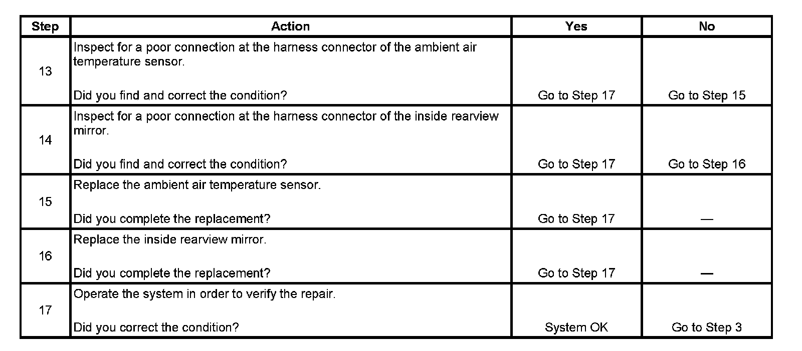 The table will be used to measure the resistance of the sensor and compare it with the actual ambient temperature. The mirror's temperature accuracy should be within 5 degrees of the actual temperature. The actual temperature should not be taken from a radio station, a sign displaying the temperature, etc. A temperature measuring tool such as a thermometer should be used. Some temperature measuring tools may be within 5 degrees of the actual temperature. Make sure to consult the manufacturer for the accuracy of the tool. This comparison can make the mirror seem off by 5-10 degrees of the actual temperature when it is not.