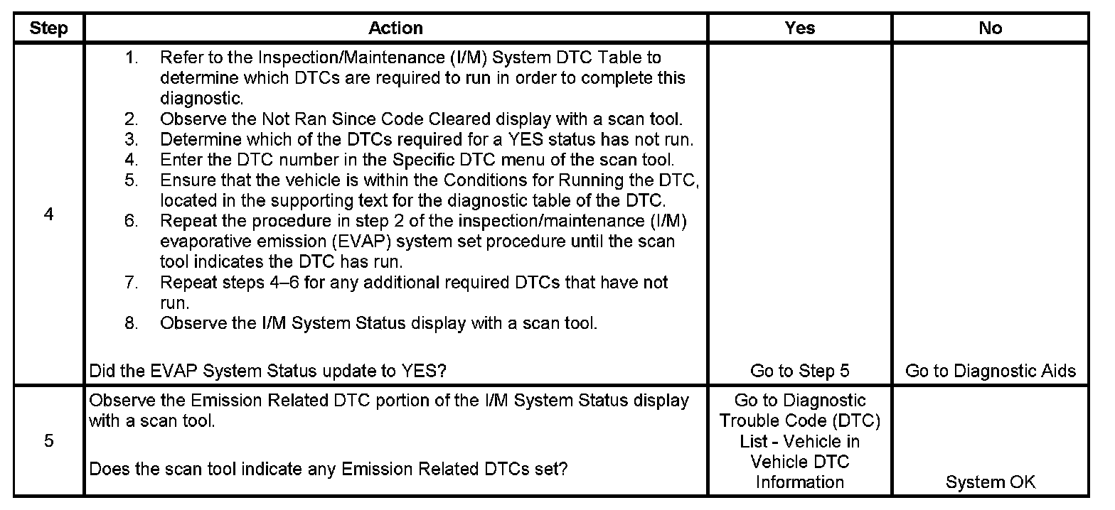 The purpose of this procedure is to satisfy the enable criteria necessary to execute inspection/maintenance (I/M) readiness diagnostics for the Evaporative Emission (EVAP) System. The procedure may be used to set the EVAP I/M System Status display on the scan tool to YES. The EVAP I/M System Status display indicates whether or not the control module has completed the readiness diagnostics. The readiness diagnostics complete when all DTCs comprising the diagnostics run and pass, or any DTC comprising the diagnostics illuminates the malfunction indicator lamp (MIL). If the diagnostics pass during one drive cycle, seventeen hours must elapse, regardless of whether the vehicle is driven or not. Then, the diagnostics will run again during the next drive cycle in which the conditions for running are met. Once the diagnostics have passed during the third drive cycle, the EVAP I/M System Status display will be updated to YES. A failed or aborted diagnostic will require the vehicle to cool down in order to meet the enable criteria for another drive cycle. Therefore, performing a visual inspection prior to running the EVAP test may prevent having to repeat the drive cycle.