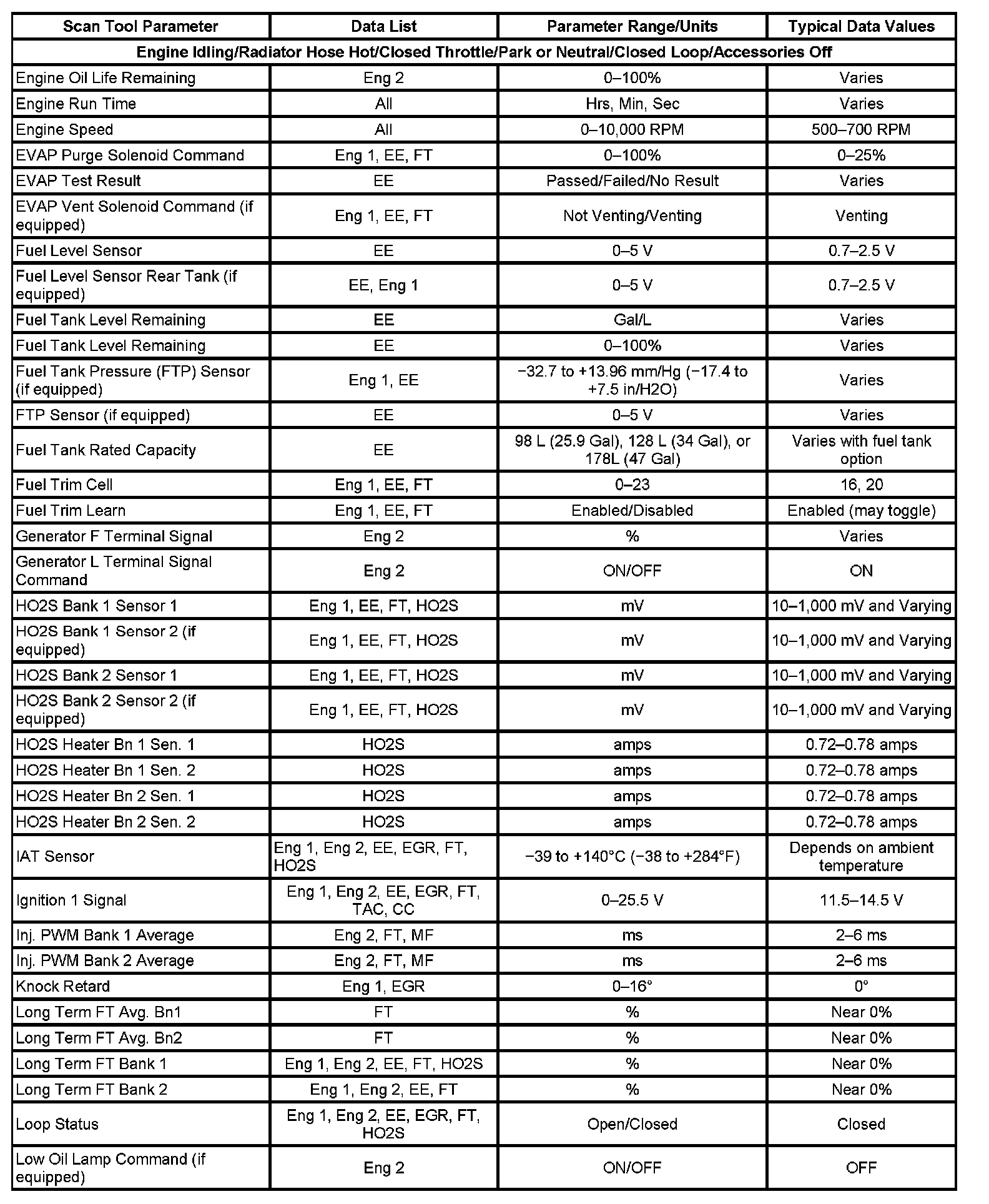 Scan tool values from a properly running engine may be used for comparison with the engine you are diagnosing. The Engine Scan Tool Data List represents values that would be seen on a normal running engine.