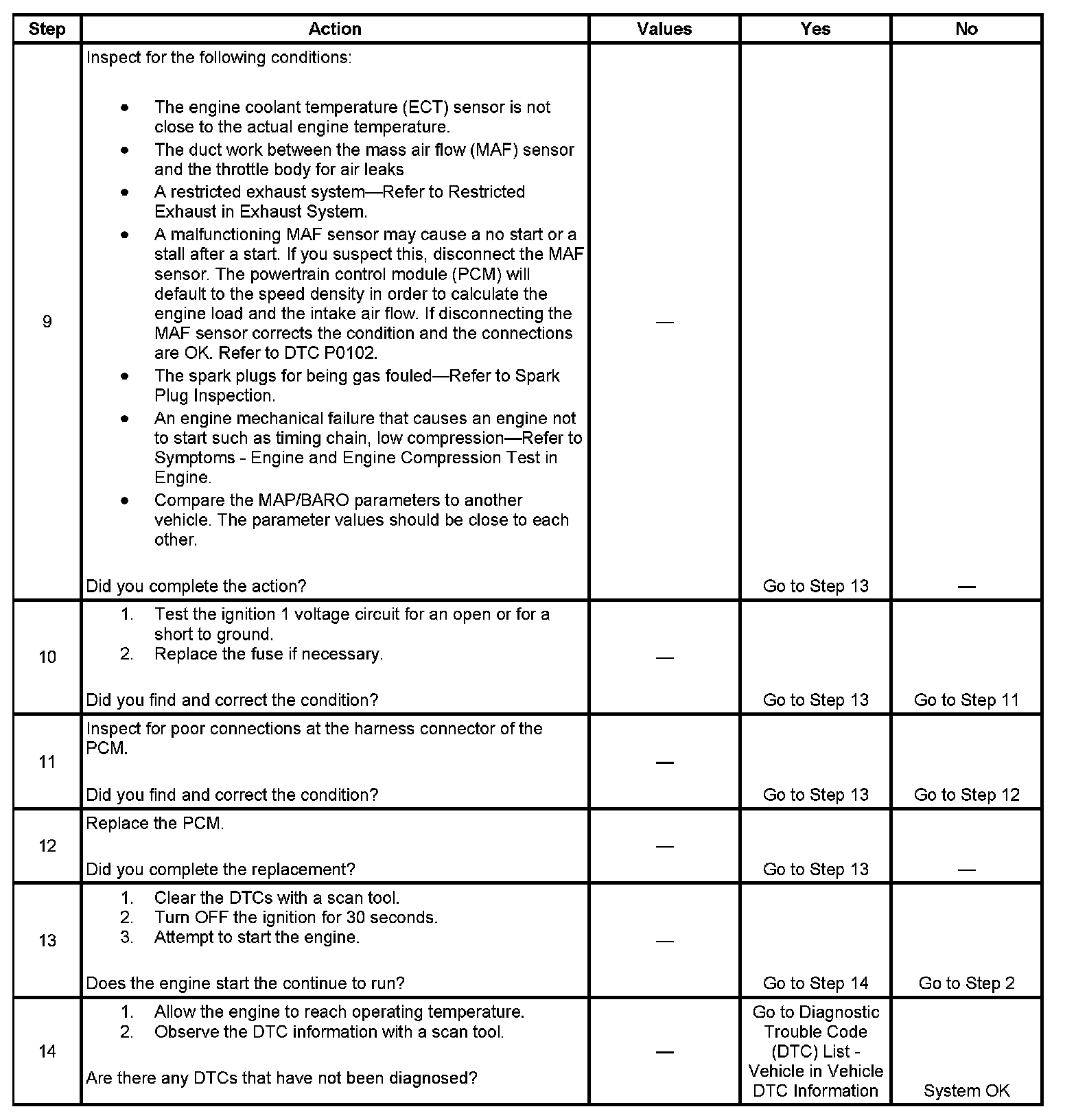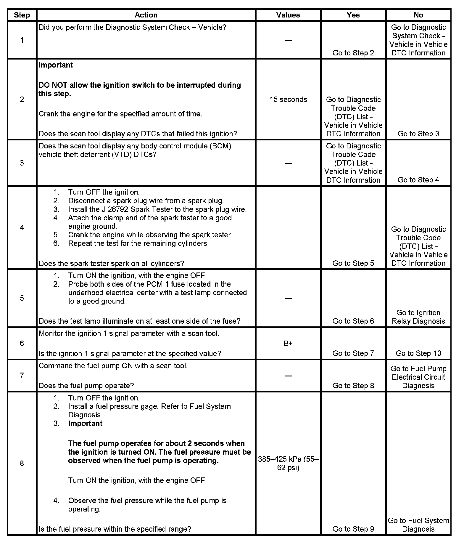 The Engine Cranks but Does Not Run diagnostic table is an organized approach to identifying a condition that causes an engine to not start. The diagnostic table directs the service technician to the appropriate system diagnosis. The diagnostic table assumes the following conditions are met: