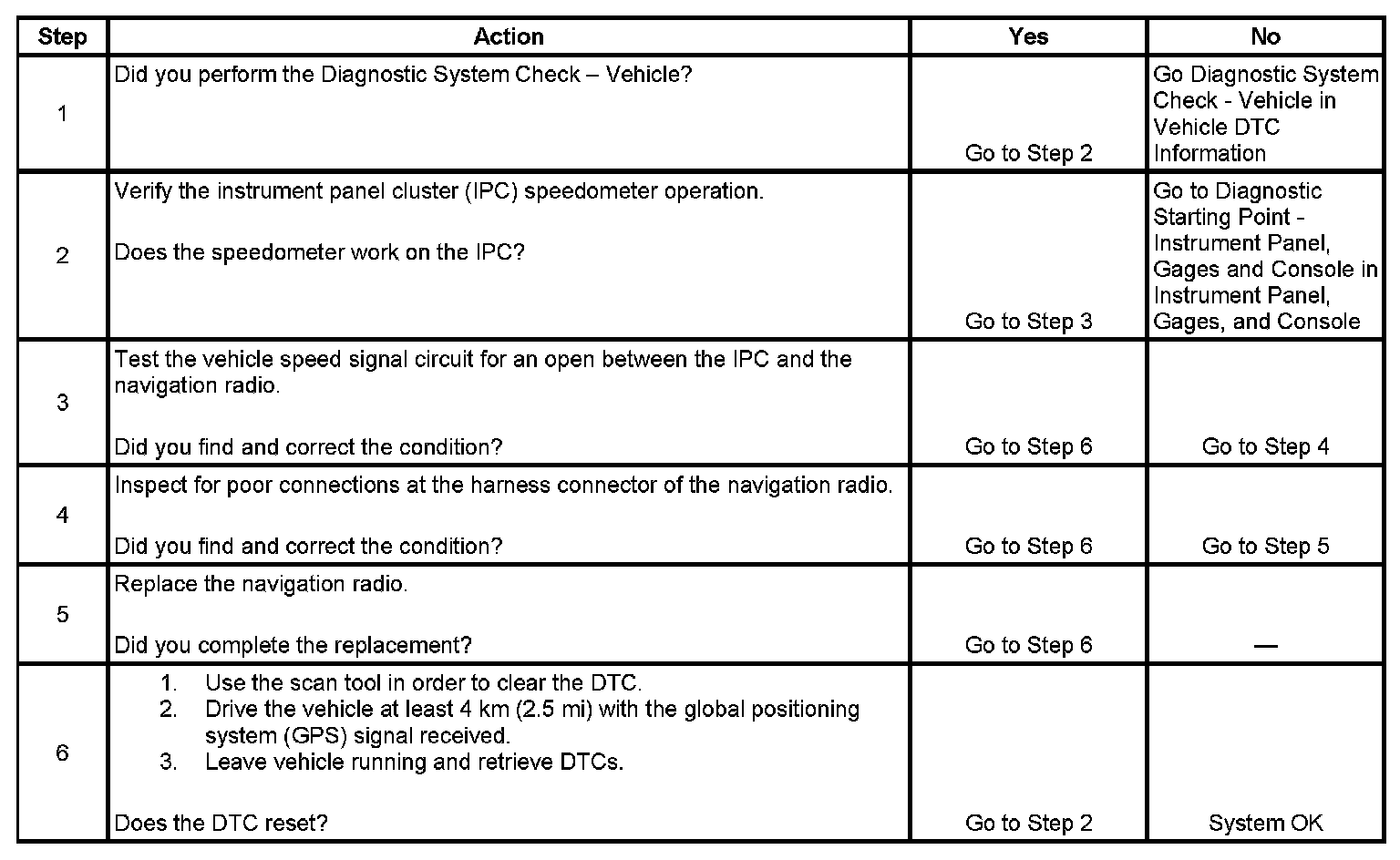The navigation radio compares the vehicle speed signal from the PCM to the GPS location signal every second. If the GPS signal indicates that the vehicle has traveled 4 km (2.5 mi) but no vehicle speed signal was received, the radio sets the DTC.