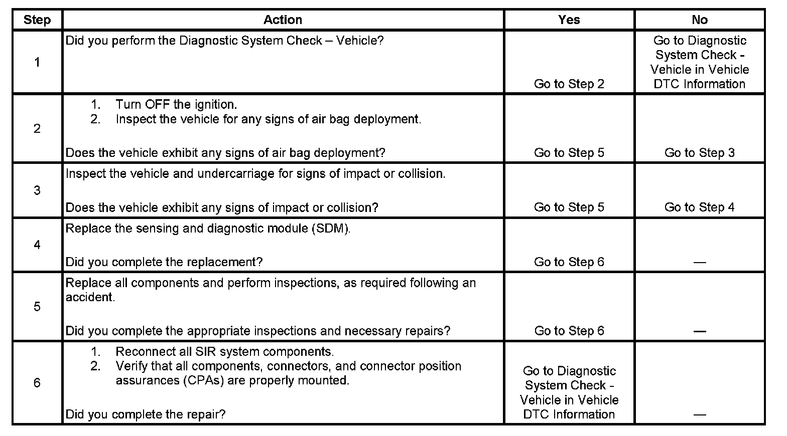 The inflatable restraint sensing and diagnostic module (SDM) contains a sensing device that converts changes in vehicle velocity to an electrical signal. The SDM compares this signal to a value stored in memory. When the generated signal exceeds the stored value, the SDM performs additional signal processing and compares the generated signals to values stored in memory. When 2 of the generated signals exceed the stored values, the SDM will cause current to flow through the inflator modules, deploying the air bags. DTC B0053 will set instead of DTC B0051 when a deployment occurs while an inflator circuit fault is present that may result in a non-deployment situation in one or more of the inflator modules.