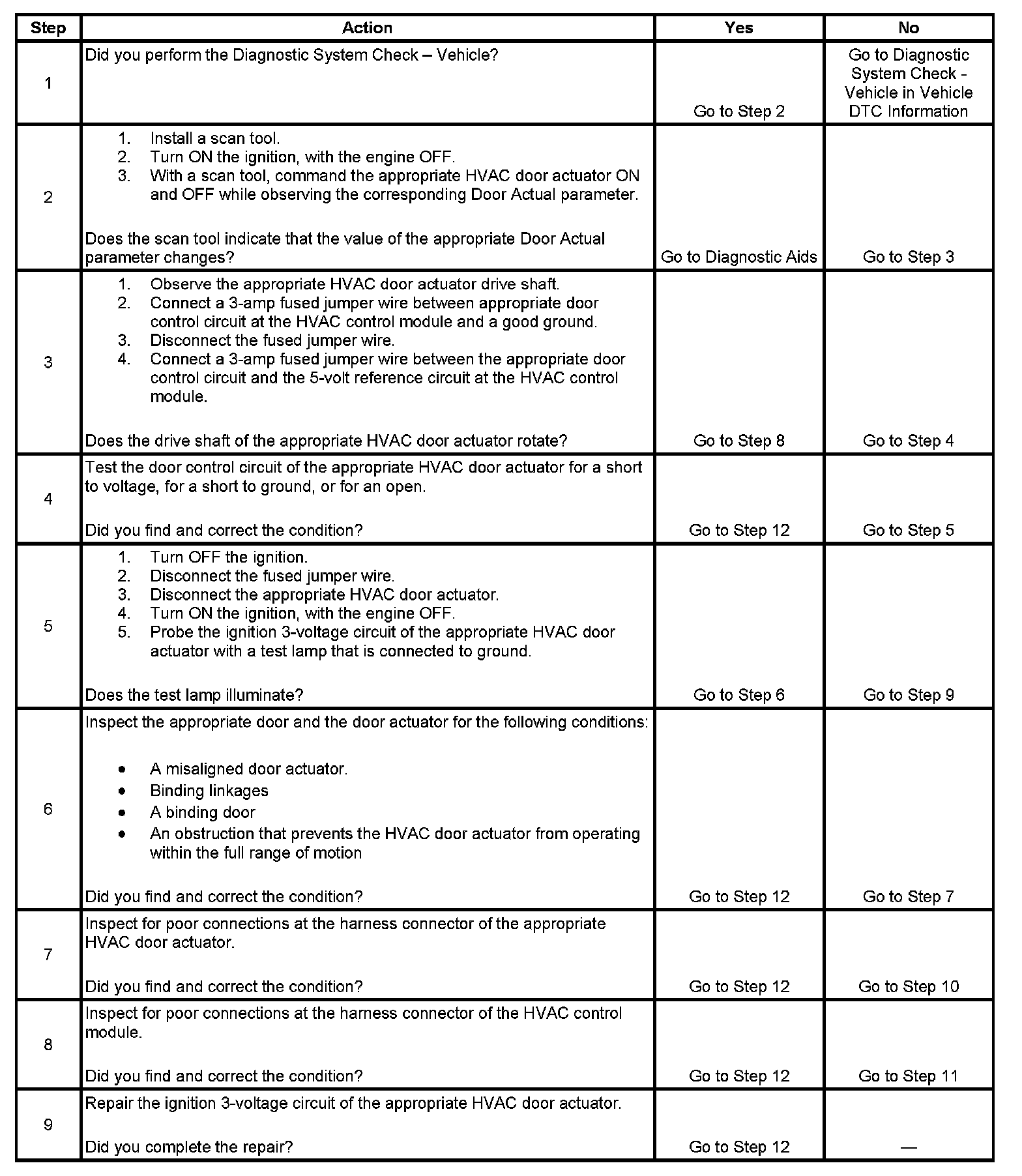 The HVAC control module controls the HVAC door actuators to regulate the airflow through the HVAC system. Each actuator consists of a stepper motor, a logic circuit, and a potentiometer. The potentiometer inside the door actuator allows the module to monitor the current position of the actuator drive shaft. The logic circuit inside the actuators receives control signals from the HVAC control module and controls the internal stepper motor. When a door positional change is required, the HVAC control module calculates a commanded door position. The module compares the commanded door position to the actual door position and determines the needed direction of motor rotation. The module applies a signal voltage to the door control circuit that is an input to the internal logic circuit of the door actuator. A 5-volt signal increases the door position. A 0-volt signal decreases the door position. When the commanded door position is equal to the actual door position, the HVAC control module sends a 2.5-volt signal to the door actuator and motor rotation stops. The ignition 3-voltage circuit provides source voltage to the logic circuit. The module provides ground to the actuator logic circuit through the low reference circuit.