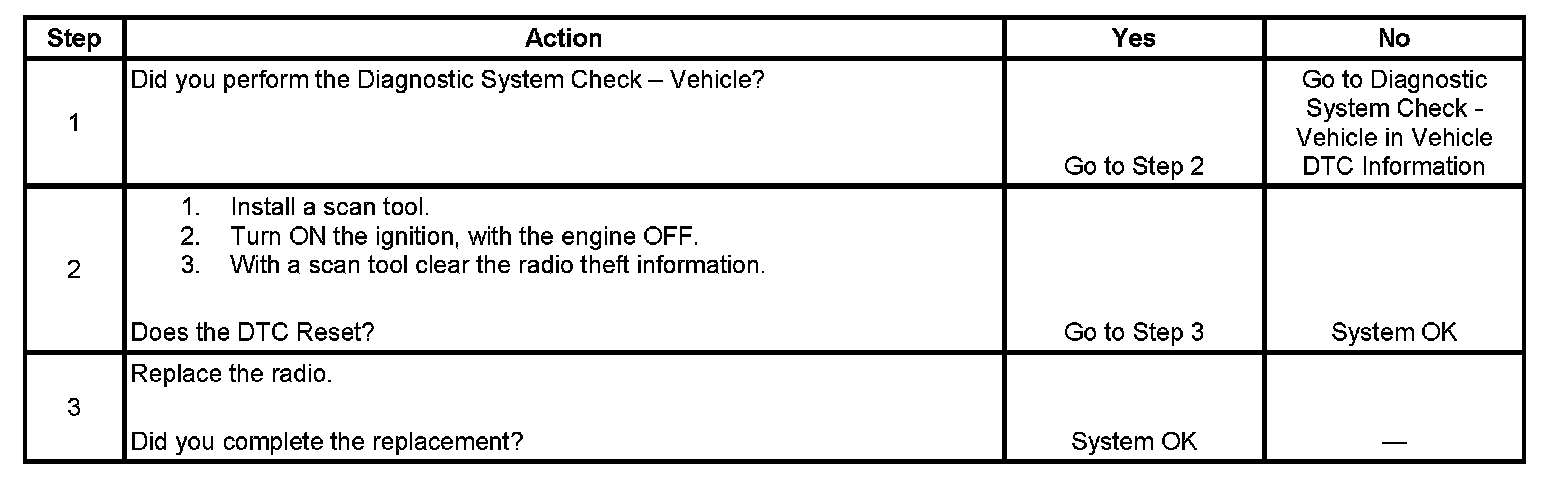 This DTC is generated by the module when the theft lock is activated. This occurs when the VIN as received over the class 2 communication circuit and the vehicle identification number (VIN) as stored in the module memory do not match. This also occurs when no VIN is received over the class 2 circuit. The only circuit required is the class 2 communications line.