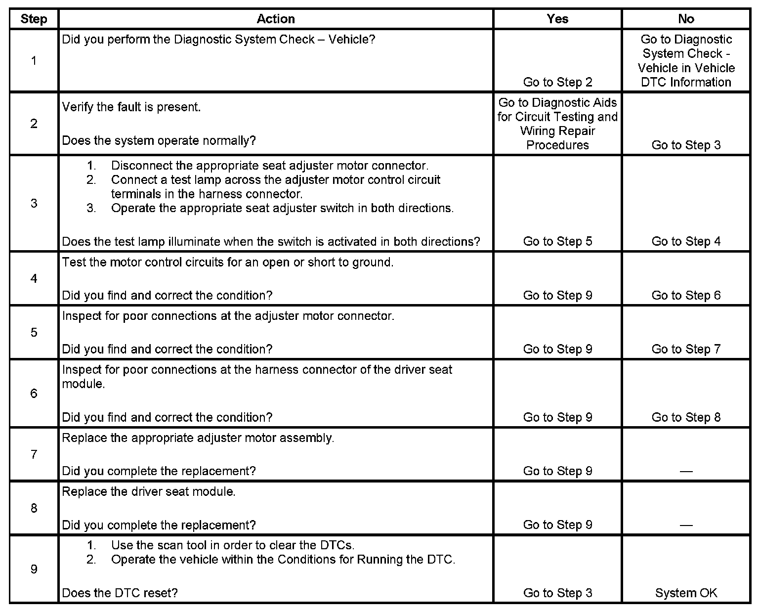 The motor control circuit monitored by the driver seat module is determined to be shorted to ground, battery positive voltage, or open.