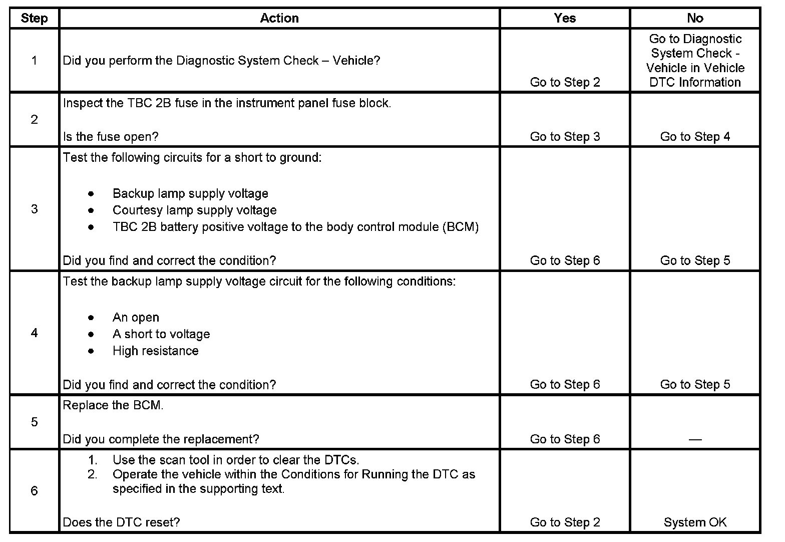 - When the BCM is not receiving a backup lamp request signal and the backup lamp supply voltage circuit is open or shorted to voltage.